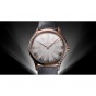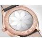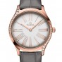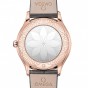 36㎜のスリムなケースは18Kセドナ™ ゴールド製で、両サイドを曲線に沿ってダイヤモンドが飾ります。リュウズはレッドのハイセラムでポリッシュ仕上げが施されており、ダイヤモンド1個がセットされています。ラッカー仕上げのオパーリンシルバーのダイアルには、エンボス加工を施した18Kセドナ™ ゴールドのローマ数字と、同じ18Kセドナ™ ゴールドを使用した針が配されています。