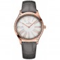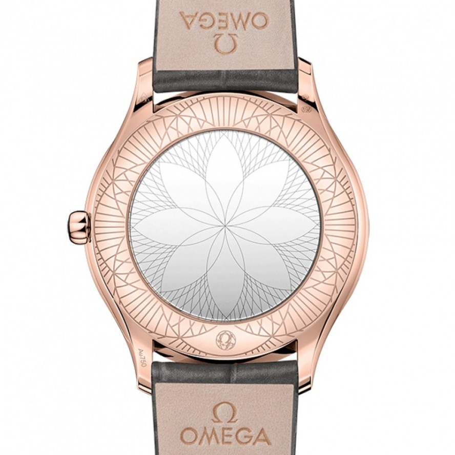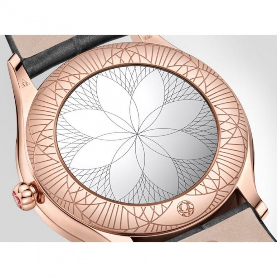 オメガ キャリバー 4061搭載。特殊な鏡面仕上げのケースバックには「Her Time」のパターンがあしらわれています。グレーのレザーストラップが付属。