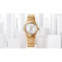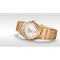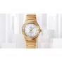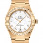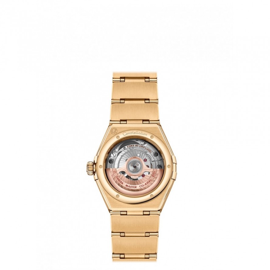 この29mmの18Kイエローゴールド製モデルは、ダイヤモンドに彩られたベゼルが印象的で、マザーオブパールのダイアルには、ダイヤモンドのインデックスと、6時位置に日付窓があります。ブレスレット、針、オメガロゴ、コンステレーションの「星」、ダイヤモンドインデックスのベゼルにも18Kイエローゴールドが使用されています。