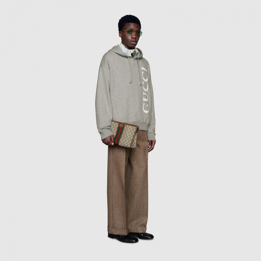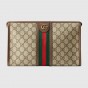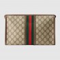GGスプリーム キャンバスで仕立て、グリーン/レッド/グリーン ウェブ ストライプのトリムとダブルG ハードウェアをあしらったジップ付きポーチ。最新コレクションでは、グッチの代表的なモチーフをクラシカルに組み合わせた〔オフィディア〕ラインに、新たなフォルムやシルエットを取り入れたアイテムが加わりました。