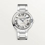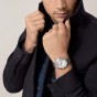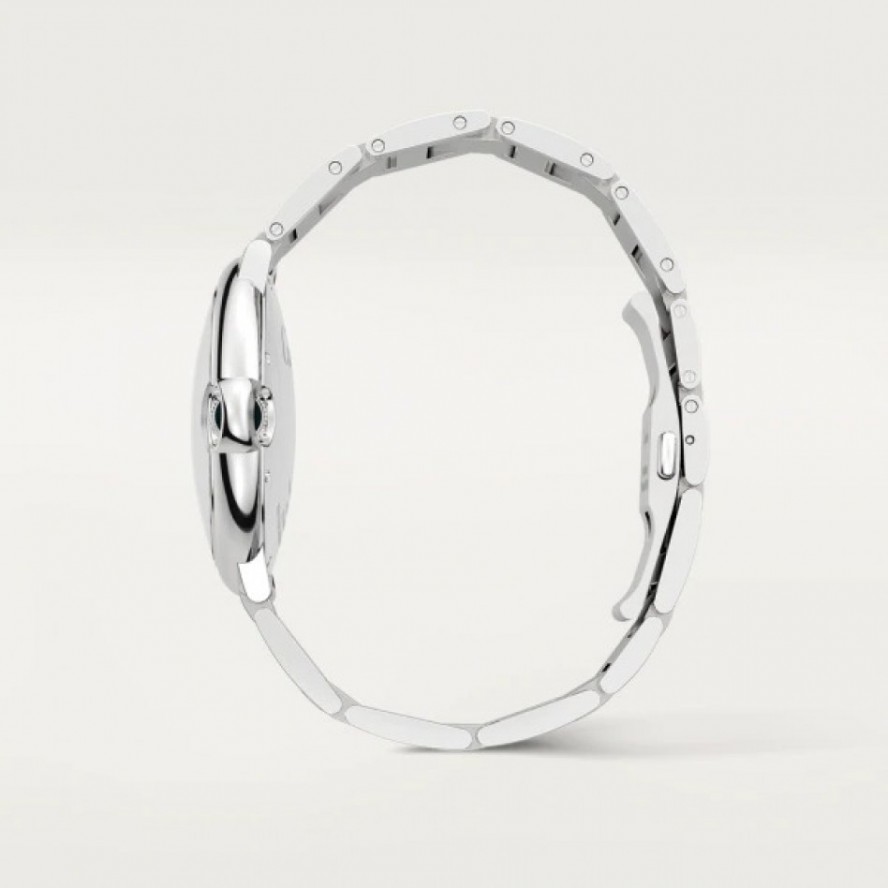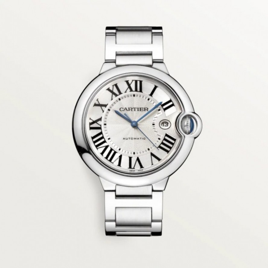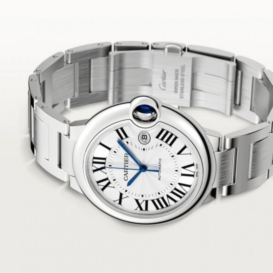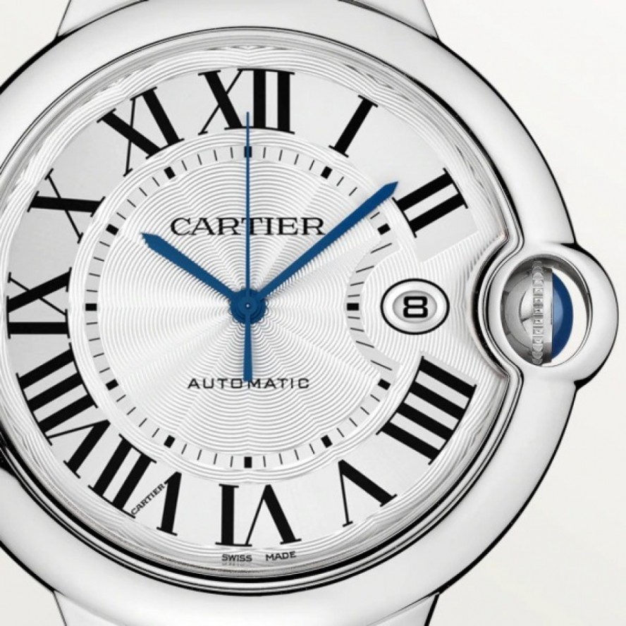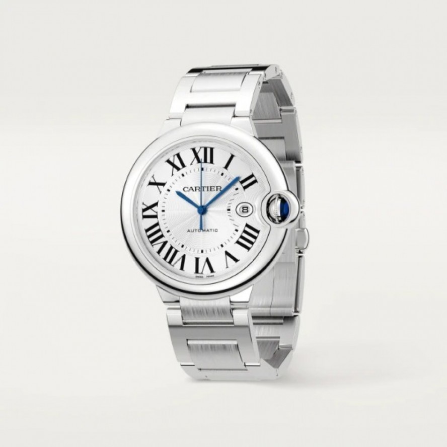 バロンブルードゥカルティエウォッチ、42 mm、機械式自動巻きムーブメント。ステンレススチールケース、合成カボションスピネル、シルバーギョーシェダイヤル、ローマ数字、ブルースティールソード型の針、サファイアクリスタル、ステンレススチールブレスレット、3時位置のカレンダー表示ウィンドウにセットされた溝付きクラウン。ケース寸法:直径:42.1mm、厚さ:13mm。30メートル/100フィートまで防水。