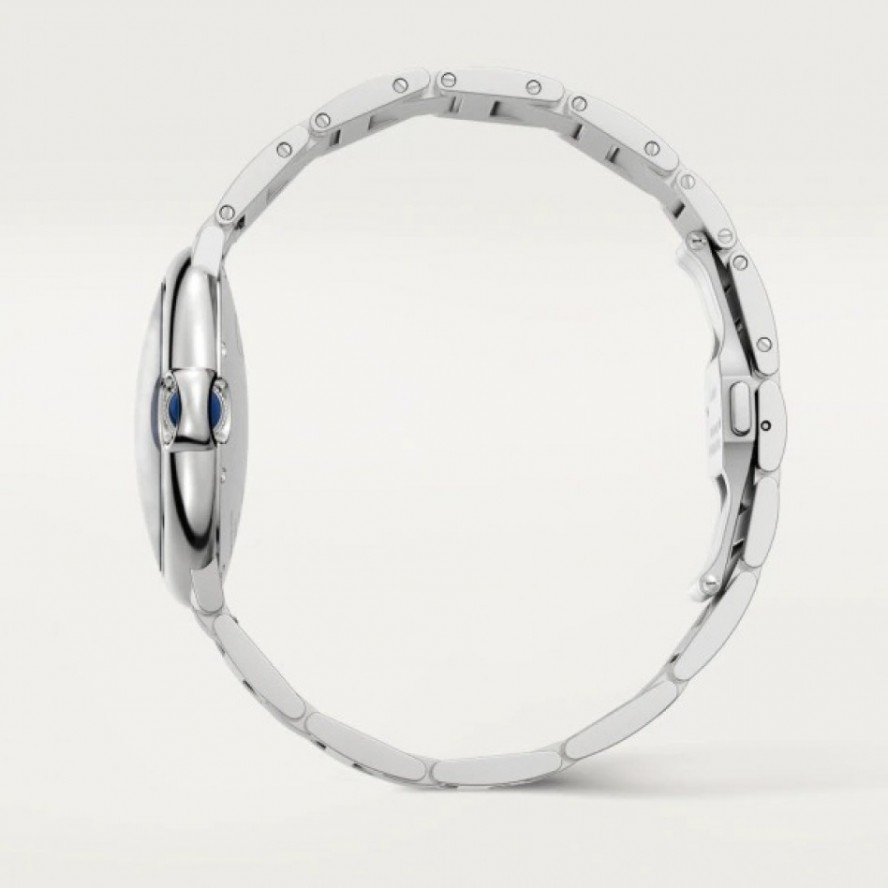 バロンブルードゥカルティエウォッチ、40 mm、1847MC自動巻き機械式ムーブメント。ステンレススチールケース、1つの合成カボションスピネルをセットした溝付きクラウン、サンレイパターンのブラッシュドブルーダイヤル、シルバーの剣型の針、サファイアクリスタル、交換可能なステンレススチールブレスレット、3時位置のディスプレイウィンドウのカレンダー。厚さ:12.4mm。3バール(約30メートル)の耐水性