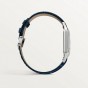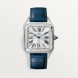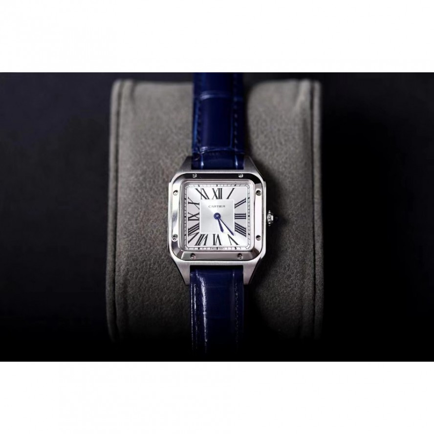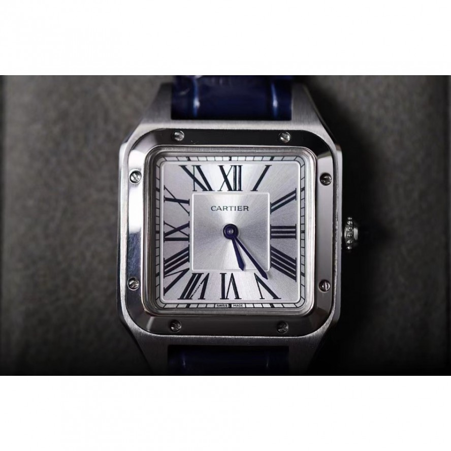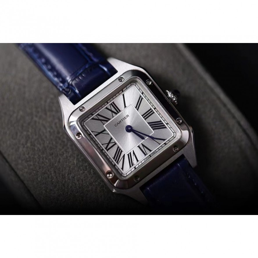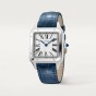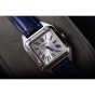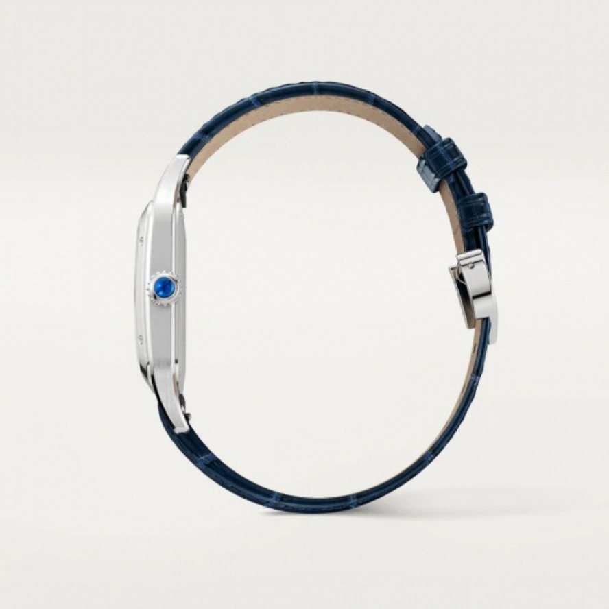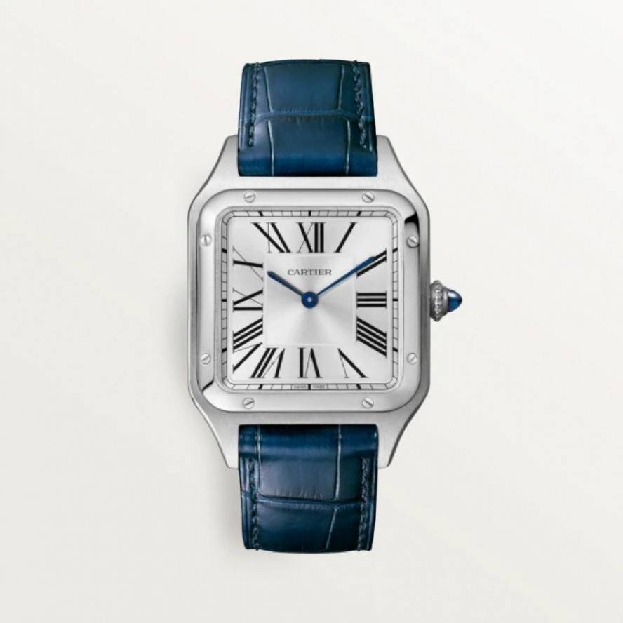 サントス-デュモン時計、大型モデル、耐久性のあるクォーツムーブメント(約6年)。ステンレススチールケース、合成ブルースピネルカボションをセットしたビーズクラウン、サンレイパターンのブラッシュドシルバーダイヤル、ローマ数字、ブルースチールソード型の針、サファイアクリスタル、ネイビーブルーアリゲーターステンレススチールピンバックル付きレザーストラップ。ケースの寸法:43.5 x 31.4 mm、厚さ:7.3mm。3バール(約30メートル)の耐水性。