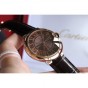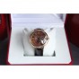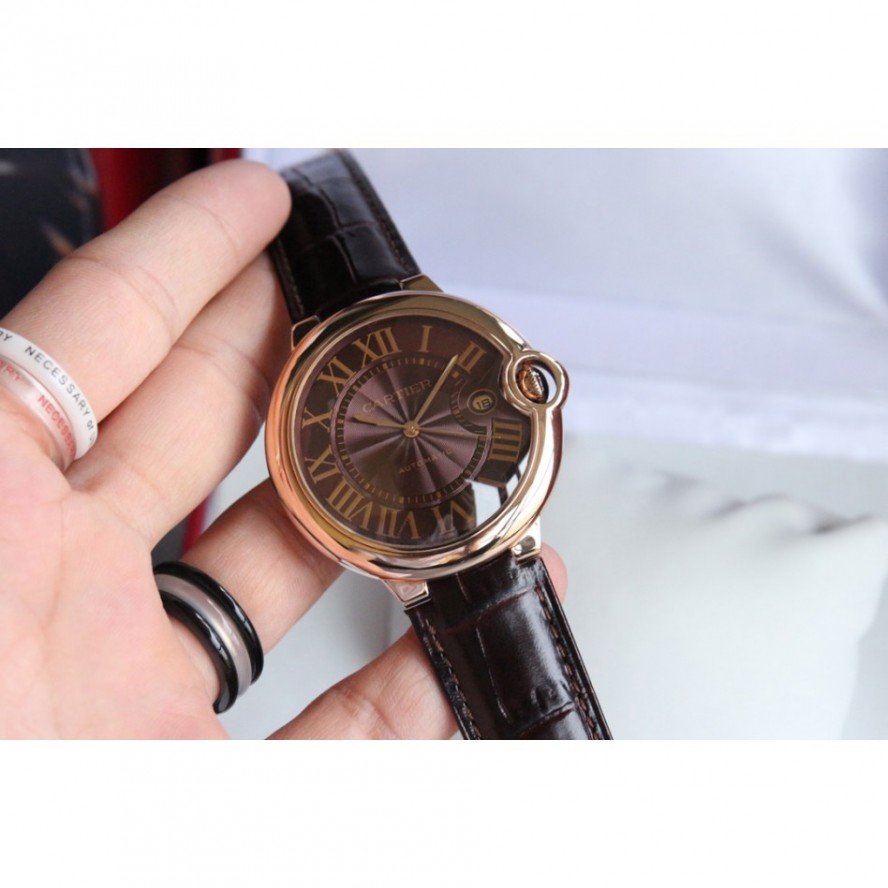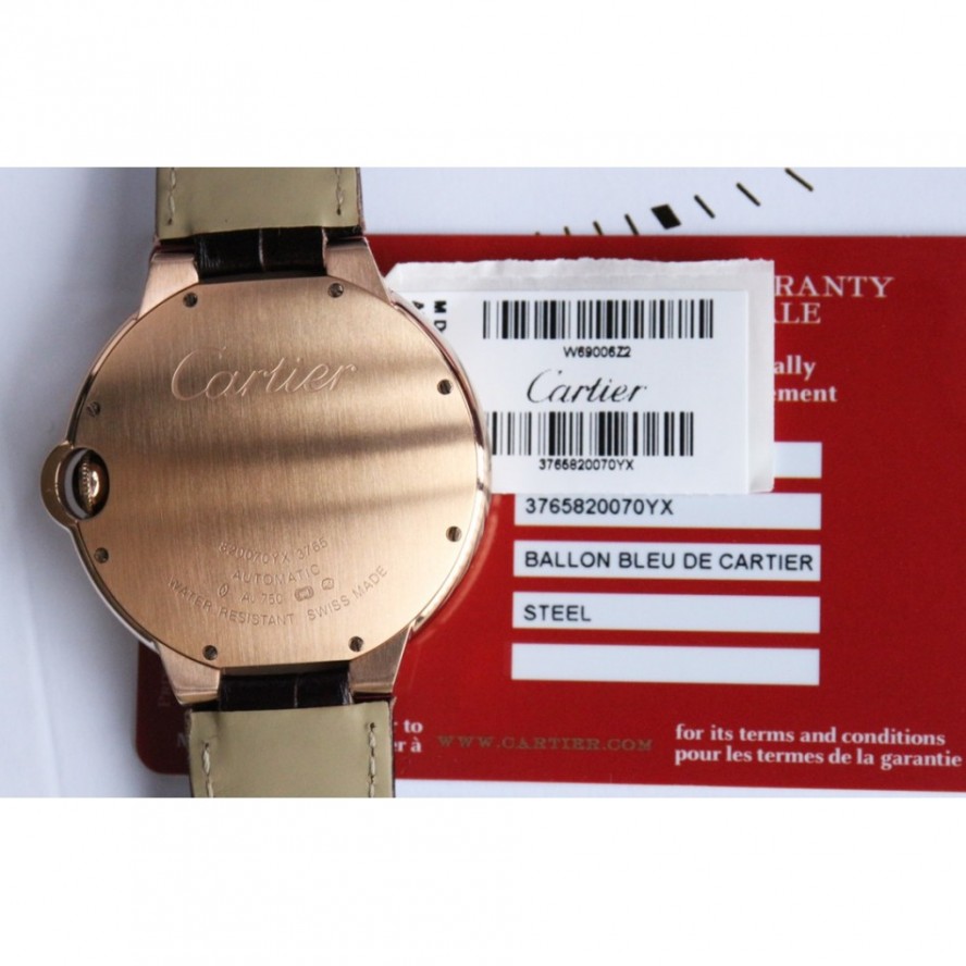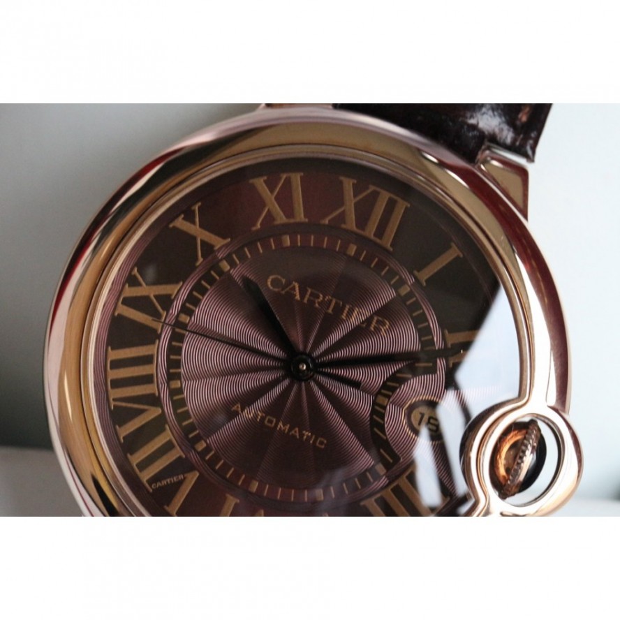 バロンブルードゥカルティエブルーバルーンウォッチ、42mmモデル。自動巻きによる機械式ムーブメント。18Kローズゴールドケース、フルーティングを施されたリューズ、カボションサファイア、チョコレートカラーのギョーシェダイヤル、ローマ数字、剣型のローズゴールドメッキステンレススチール針、サファイアクリスタル、アリゲーターレザーストラップ、カレンダーウィンドウ付き18Kローズゴールドフォールディングクラスプ3時に。ケースサイズ:直径:42.1mm。厚さ:13mm。30メートルまでの耐水性。。