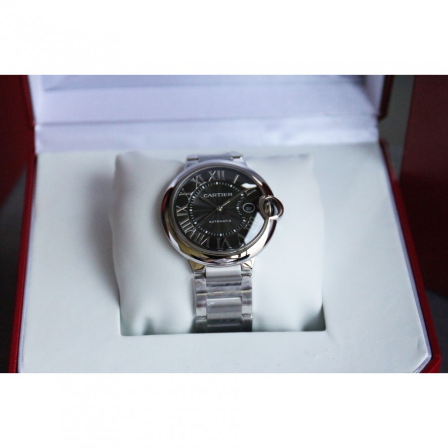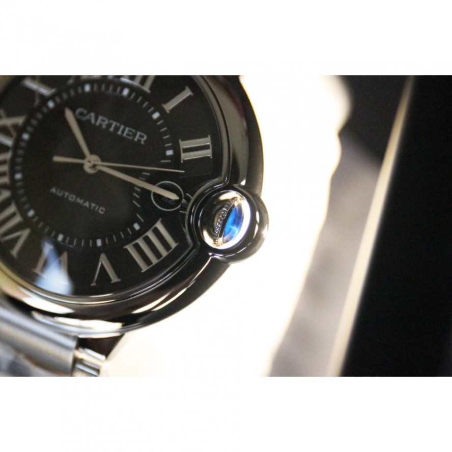 バロンブルードゥカルティエブルーバルーンカーボンコーティングウォッチ、42 mmモデル、カルティエ1847MCワークショップは自動巻きの機械式ムーブメントを洗練させました。ADLCカーボンコーティング(アモルファスダイヤモンドライクカーボンコーティング)ステンレススチールケース、溝付きクラウン、合成スピネルカボション、ブラックダイヤル、ローマ数字、剣型の発光ステンレススチール針、サファイアクリスタルミラー、ブラックカーフスキンストラップ、ステンレススチールフォールディングクラスプ、3時位置の日付表示ウィンドウ。ケースサイズ:直径:42.1mm、ケース厚さ:13mm。3バールまでの耐水性(約30メートル/ 100フィート)。