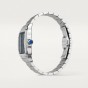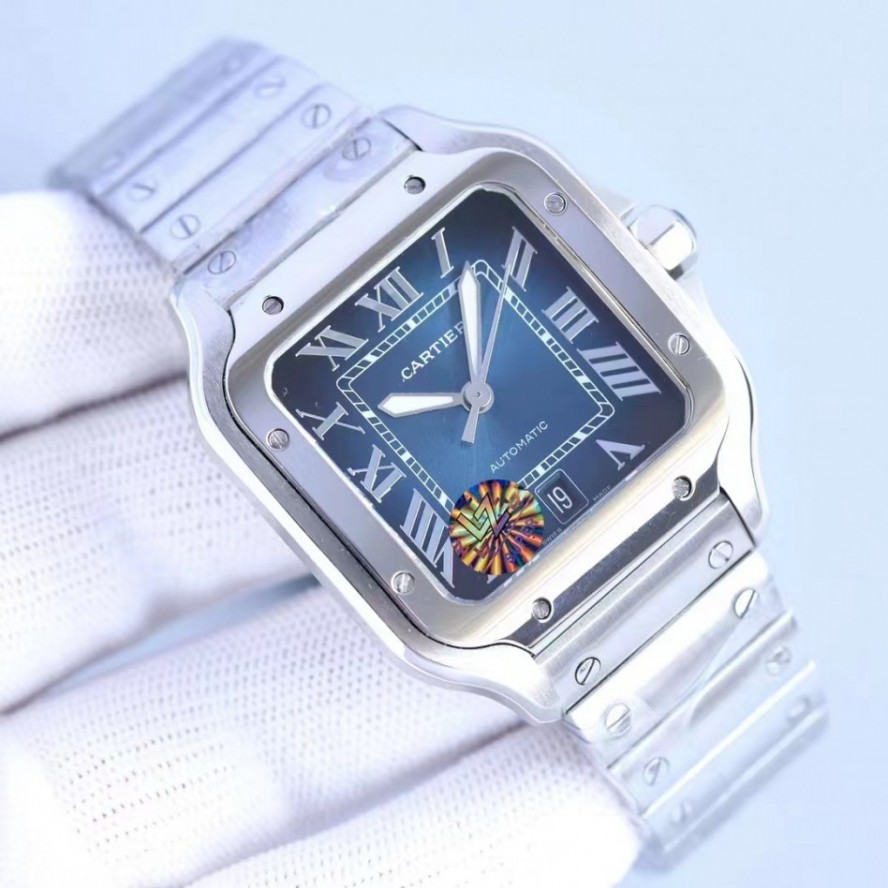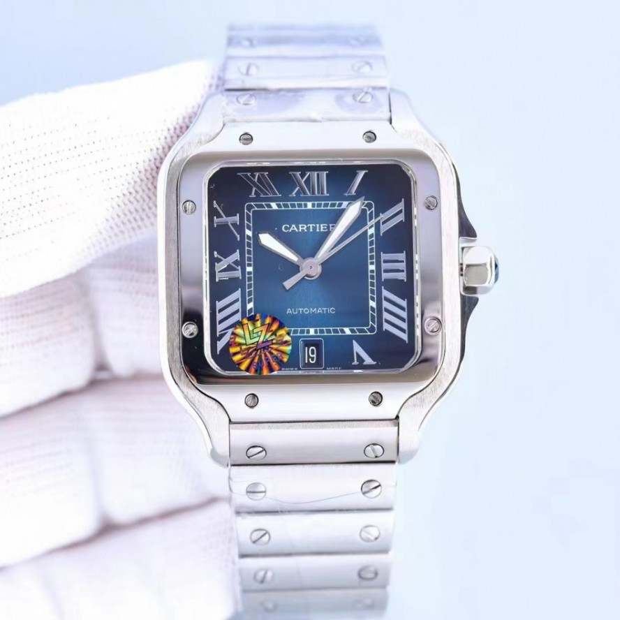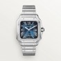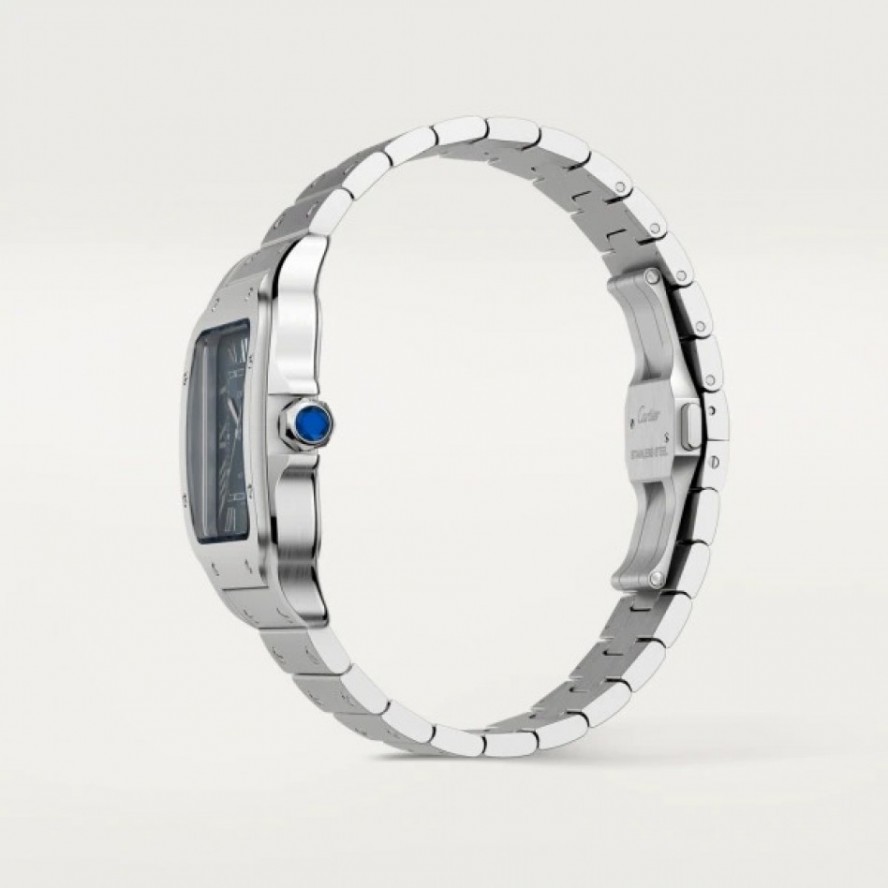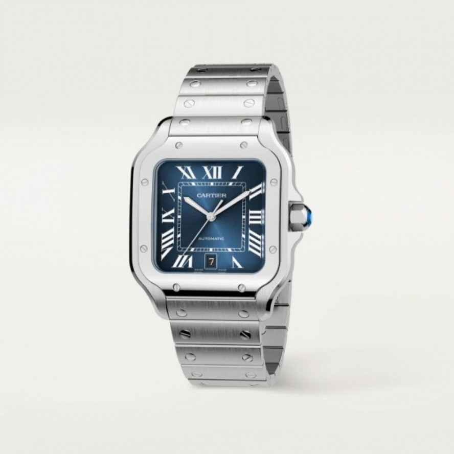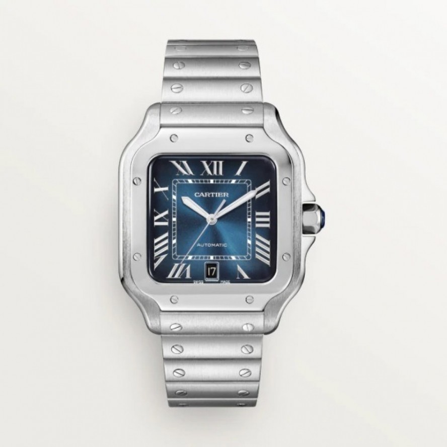 サントスウォッチ、大型モデル、1847MC自動巻き機械式ムーブメント。スチールケース、ファセットカットの合成スピネル1個、ブルーのグラデーションダイヤル、スチールの剣型の針、サファイアクリスタルをセットした7面クラウン。ステンレス製のブレスレットには、「SmartLink」サイズ調整システムが装備されています。ケース幅:39.8mm、厚さ:9.08mm。10バール(約100メートル/ 330フィート)の耐水性。