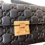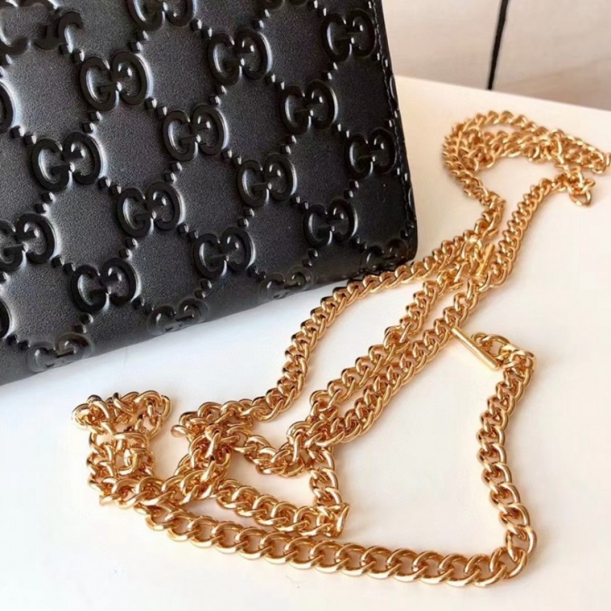 バンブークロージャーがデザインのポイントです。 のスムースレザーで仕立て、ブランド創設者グッチオ・グッチのイニシャルを表すダブルGのハードウェアと繊細なチェーンストラップをあしらいました。