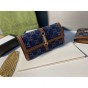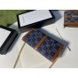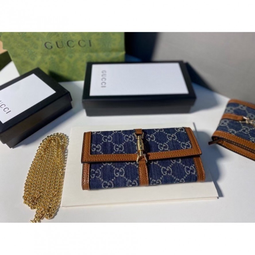 〔ジャッキー 1961〕ラインの新作コンチネンタル ウォレット。繊細なチェーンストラップ付きなので、ミニバッグとしてもお使いいただけます。エコウォッシュド GGジャカードデニムで仕立て、オリジナルの〔ジャッキー〕バッグにオマージュを捧げるゴールドトーンのピストン ディテールを配しました。