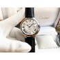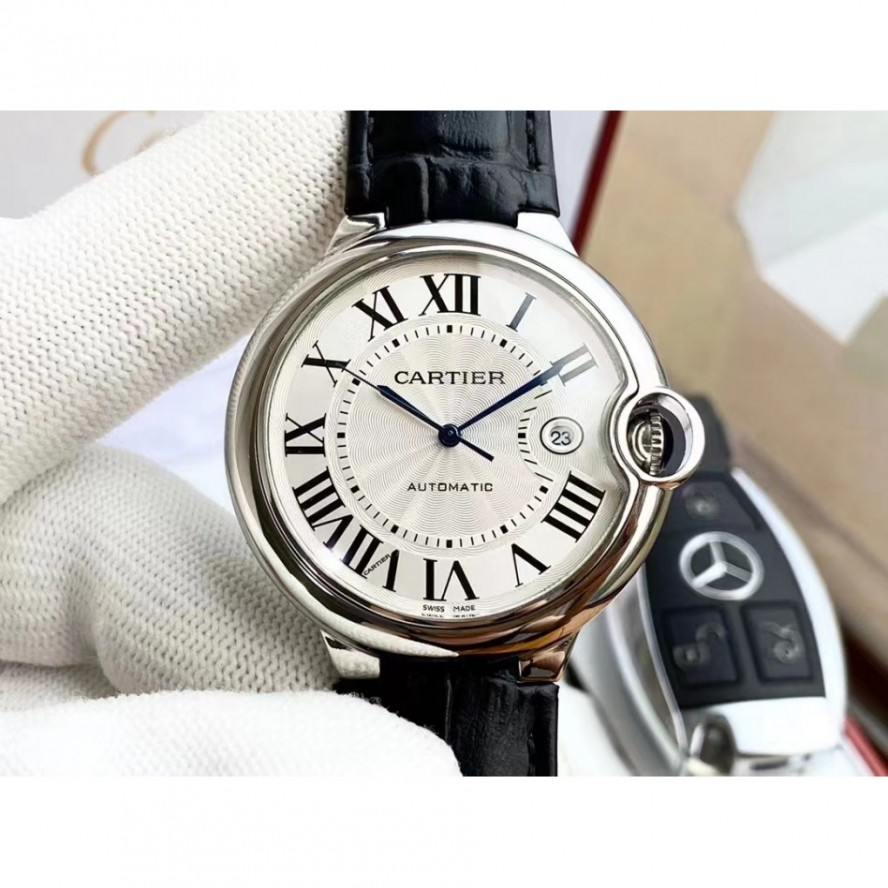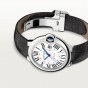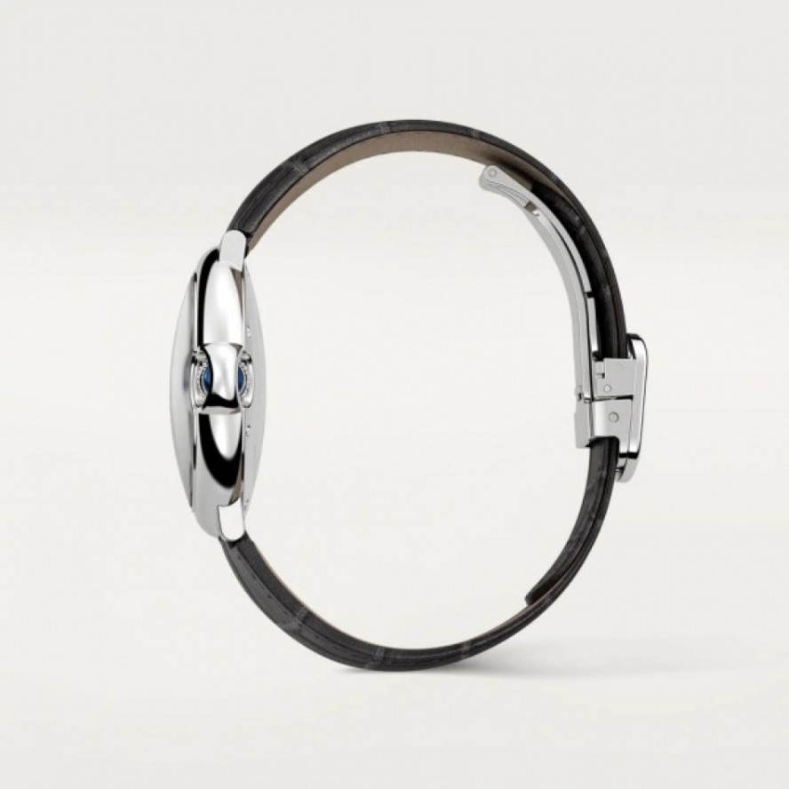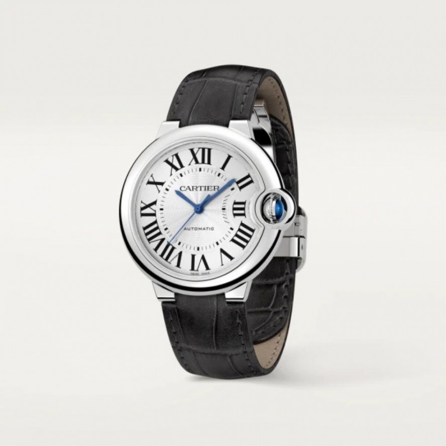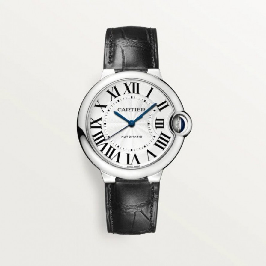バロンブルードゥカルティエウォッチ、36 mm、機械式自動巻きムーブメント。ステンレススチールケース、合成カボション型スピネル、シルバーパールギョーシェダイヤル、ローマ数字、ブルースティールソード型針、サファイアクリスタル、アリゲーターレザーストラップ、オプションの調節可能な折りたたみ式ステンレススチールクラスプをセットした溝付きクラウン。ケース寸法:直径:36.6mm、厚さ:12.05mm。30メートル/100フィートまで防水。