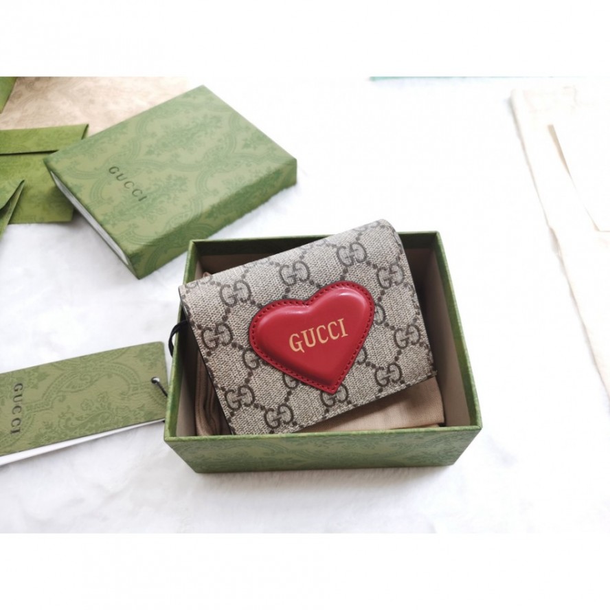GGスプリーム キャンバスで仕立てたカードケース ウォレット。 ロマンティックなハート モチーフを立体的なディテールで飾り、GUCCI ロゴをあしらいました。