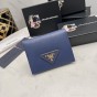コンパクトなフォルムが美しい、上質な「サフィアーノ」レザー(牛革)の財布。クレジットカードホルダー、札入れと小銭入れが備わっています。メタルのトライアングルロゴ付。