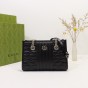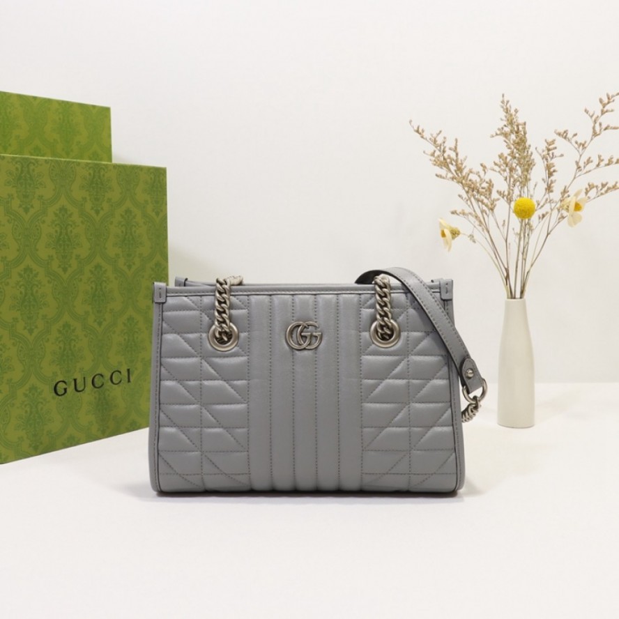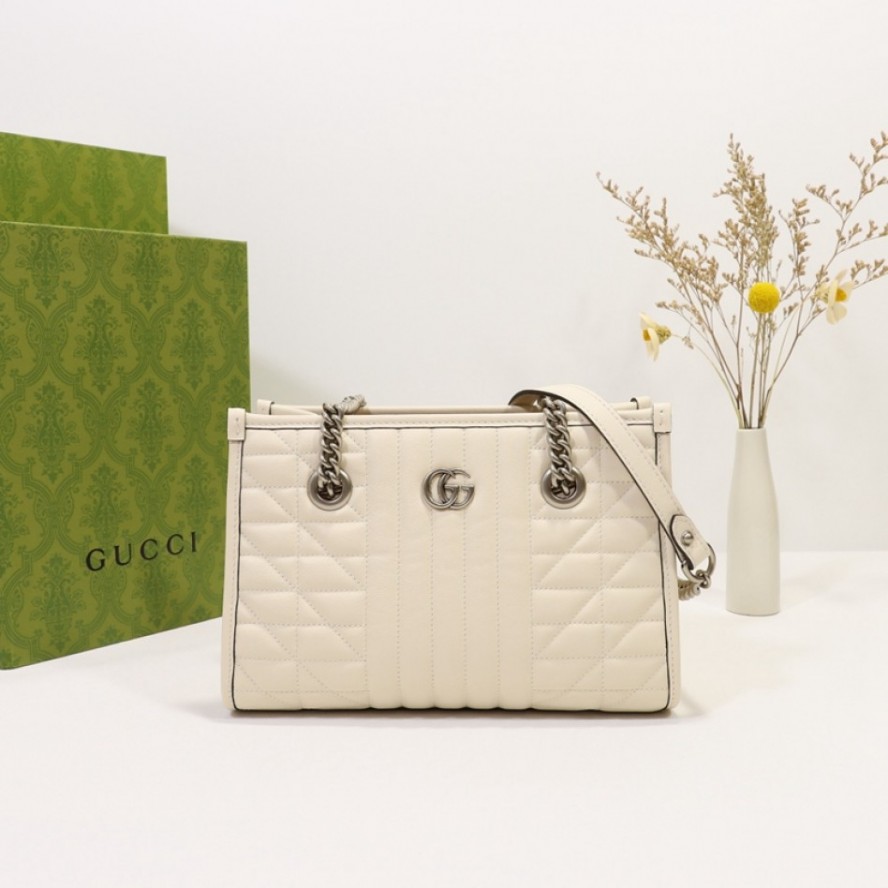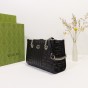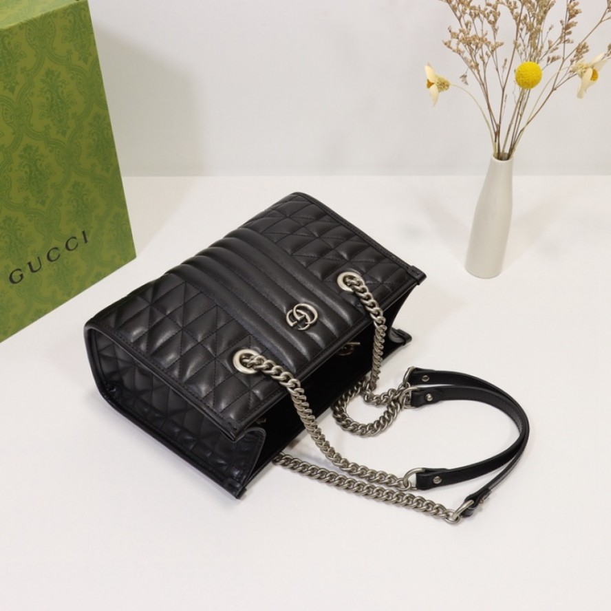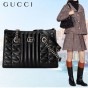 グッチのアーカイブを探求するAria コレクションは、アーカイブとコンテンポラリーのエレメントを融合させることでブランドのストーリーを伝えています。アレッサンドロ・ミケーレがクリエイティブ・ディレクターに就任した初期のファッションショーで発表された〔GGマーモント〕。その登場以来、シーズンごとに最新コレクションの要素を取り入れて進化を続けてきました。ここでは、ブラックのキルティングレザーで仕立てたトートバッグをアンティーク調のシルバートーン ハードウェアで飾っています。