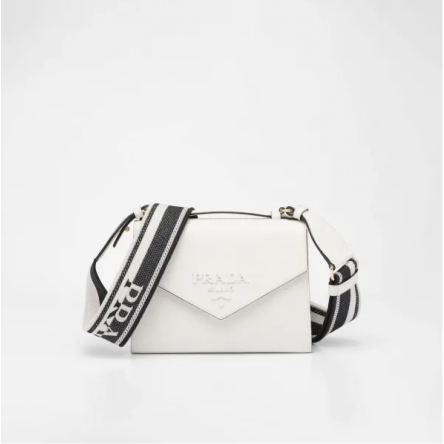 「サフィアーノ」レザー(牛革)のプラダ モノクロームバッグ。トーナルカラーのアイコニックなロゴが映える洗練されたデザイン。すっきりとした上品なラインに、コントラストカラーのロゴ刺繍入り織テープの取り外し可能なショルダーストラップ付で、使い勝手に優れたデザイン。