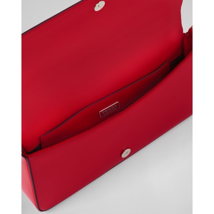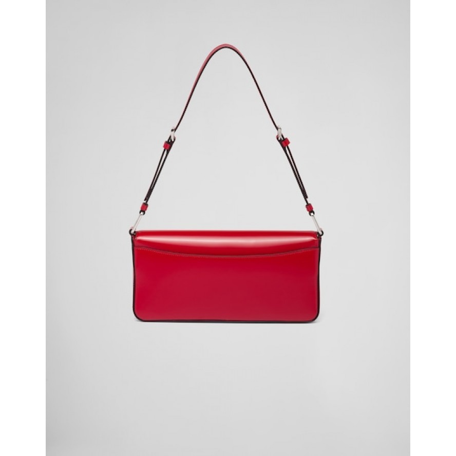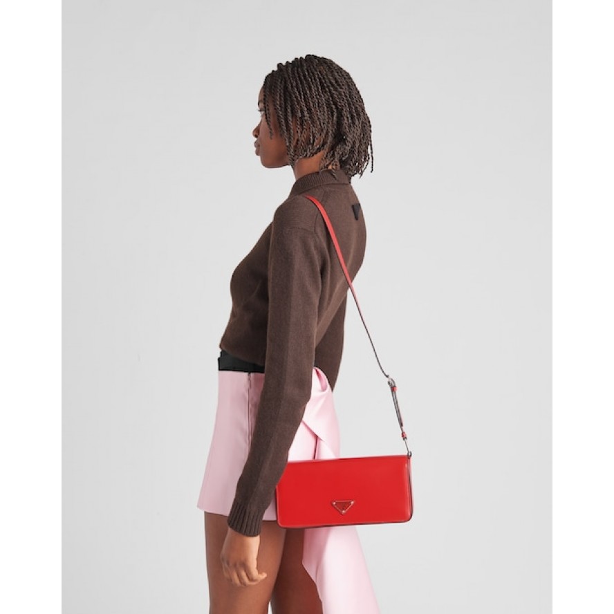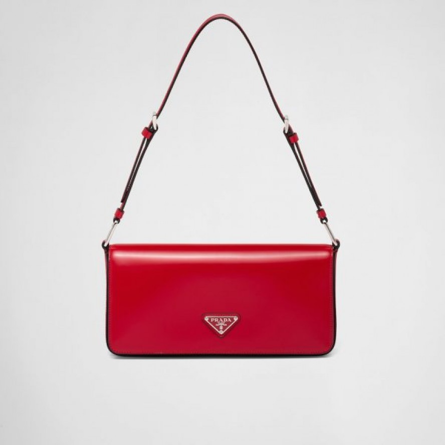 90年代の幾何学的な形状をモダンな最新スタイルに再解釈したフラップショルダーバッグ。シンプルで上品かつ個性的で使い勝手に優れたデザイン。プラダのコレクションを象徴する素材である上質なブラッシュドレザー(牛革)を使用した、横長のデザイン。調節可能な細いショルダーストラップ付で、クロスボディバッグとしてもショルダーバッグとしても使用できます。レクタンギュラーシルエットに、象徴的なエナメルメタルのトライアングルロゴがあしらわれています。