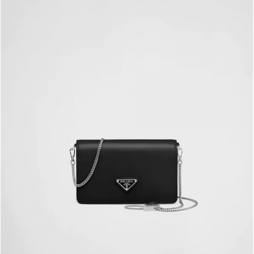 洗練されたフォルムが上品な印象を放つ、アイコニックなブラッシュドレザー(牛革)のバッグ。創業者のマリオ・プラダがデザインしたトランクに初登場して以来、ブランドのアイコンとなってきたトライアングルロゴをメタルとバッグと同色のエナメルで再解釈したデザイン。