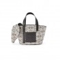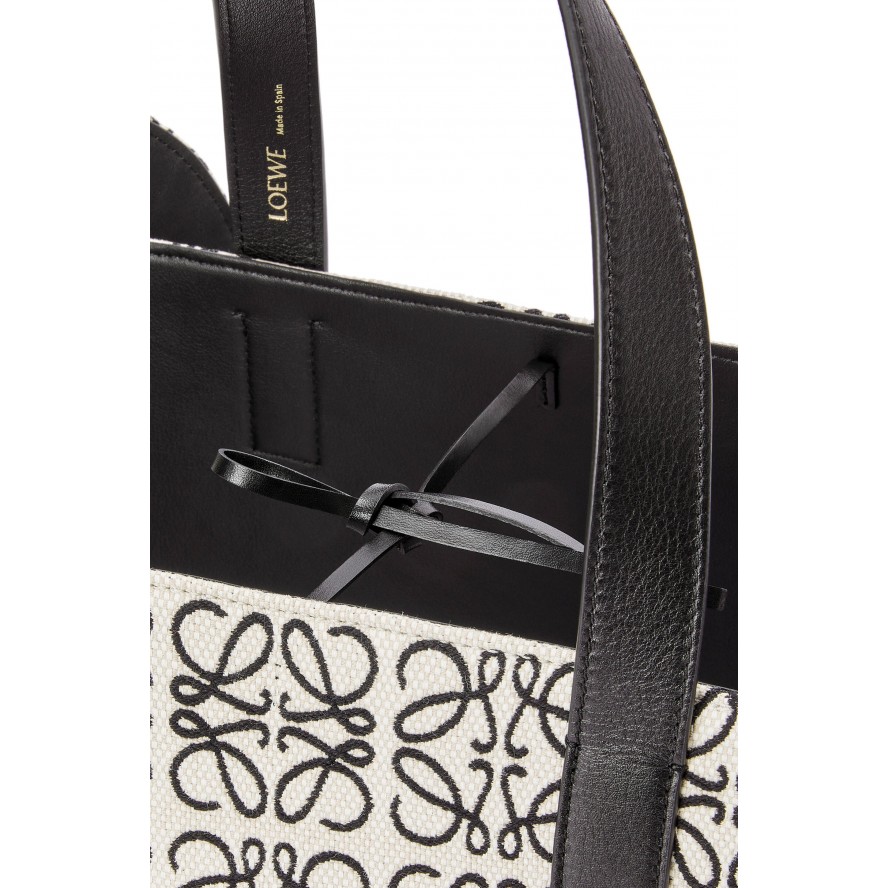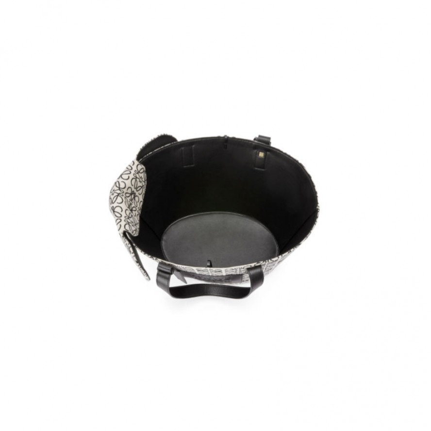ロエベのバスケットバッグの特徴的なシルエットとエレファントヘッドを組み合わせたハイブリッドバッグ。 カーフスキンとリピートアナグラム柄のキャンバスジャカード製 。
