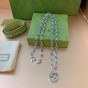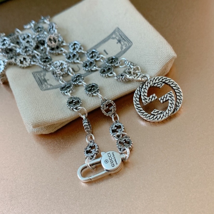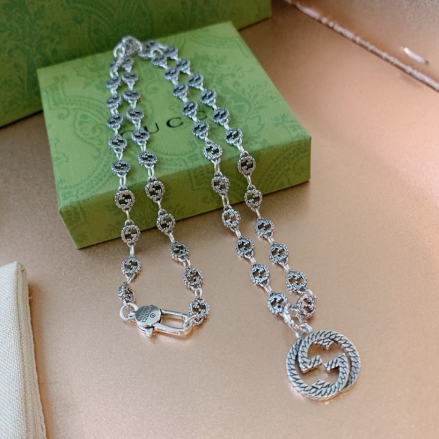 テクスチャードリンクとスムースリンクを交互に配した、コンテンポラリーな雰囲気のシルバーチェーンのネックレス。グッチを象徴するインターロッキングGをエングレービングで表現したペンダントが存在感を放っています。