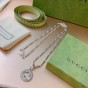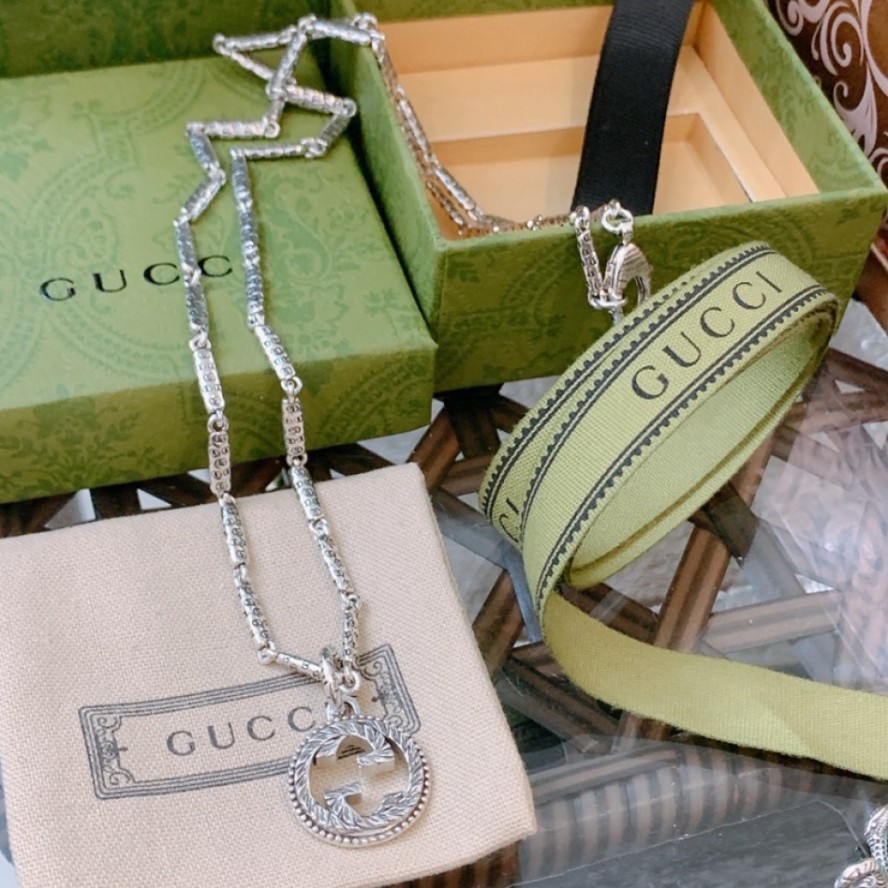 テクスチャードリンクとスムースリンクを交互に配した、コンテンポラリーな雰囲気のシルバーチェーンのネックレス。グッチを象徴するインターロッキングGをエングレービングで表現したペンダントが存在感を放っています。