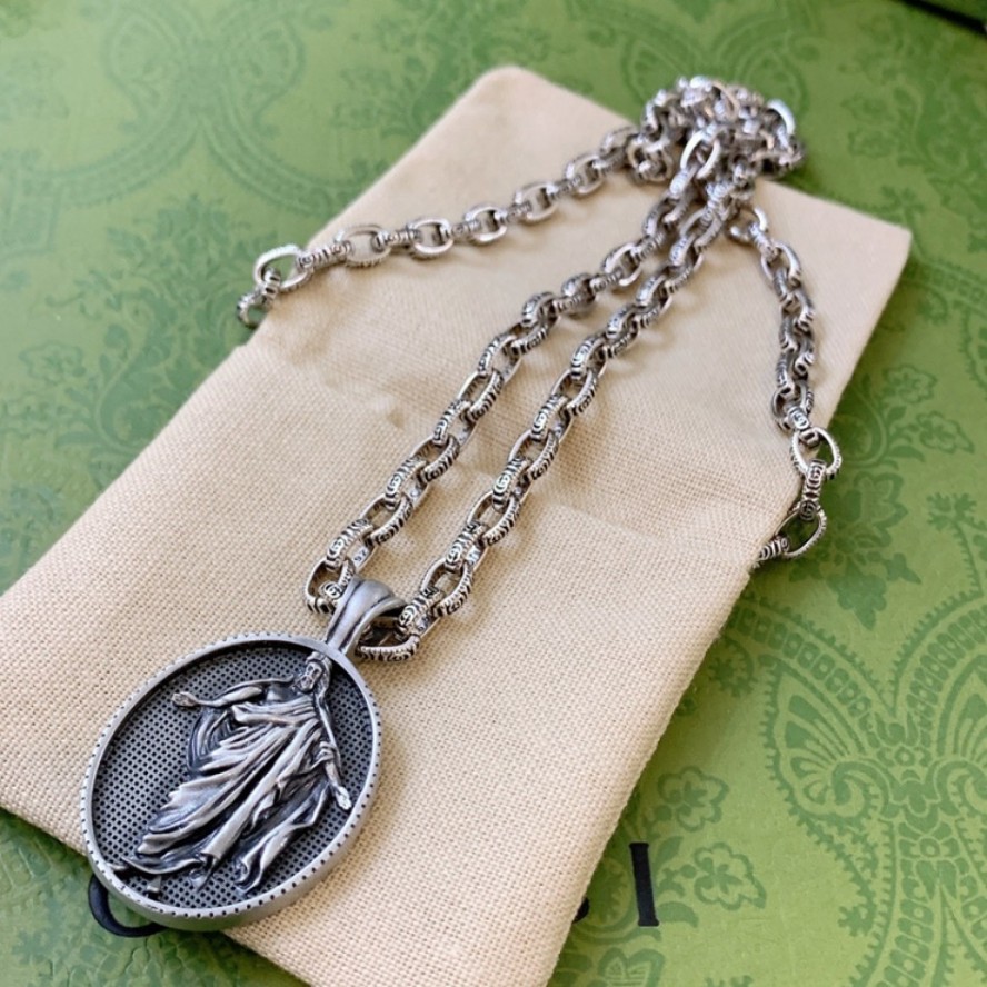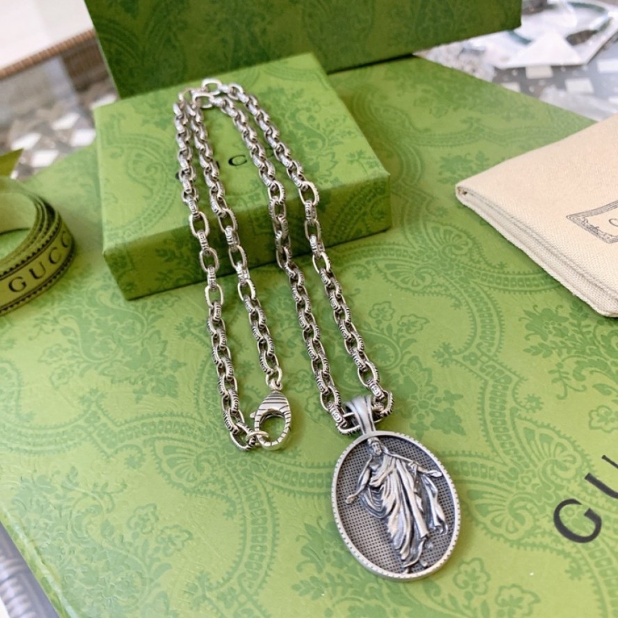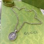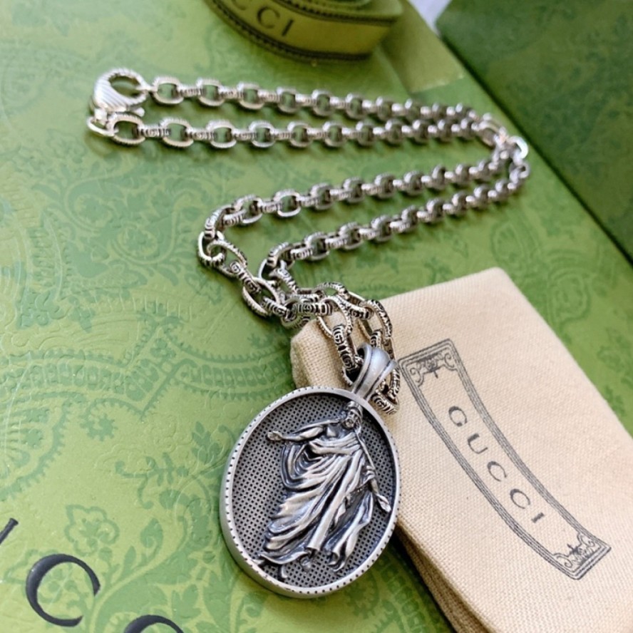 テクスチャードリンクとスムースリンクを交互に配した、コンテンポラリーな雰囲気のシルバーチェーンのネックレス。グッチを象徴するインターロッキングGをエングレービングで表現したペンダントが存在感を放っています。