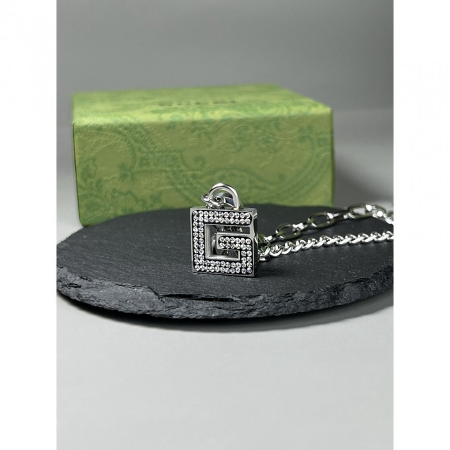 テクスチャードリンクとスムースリンクを交互に配した、コンテンポラリーな雰囲気のシルバーチェーンのネックレス。グッチを象徴するインターロッキングGをエングレービングで表現したペンダントが存在感を放っています。