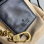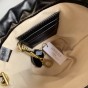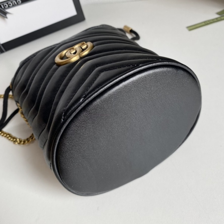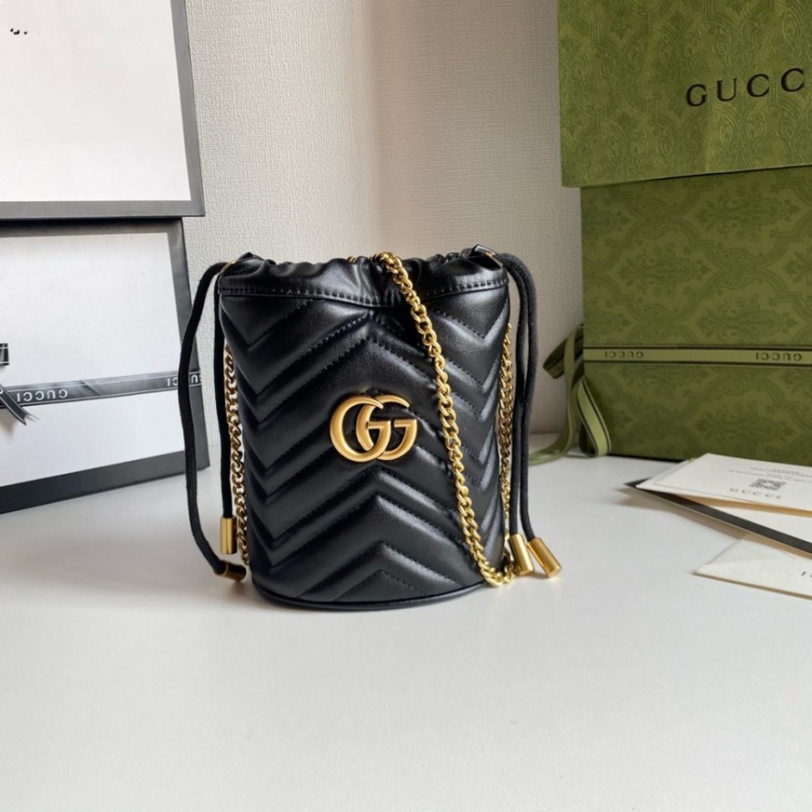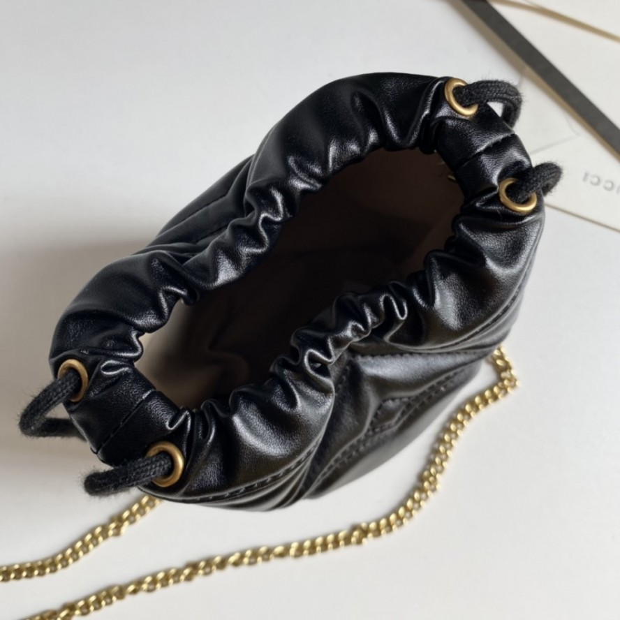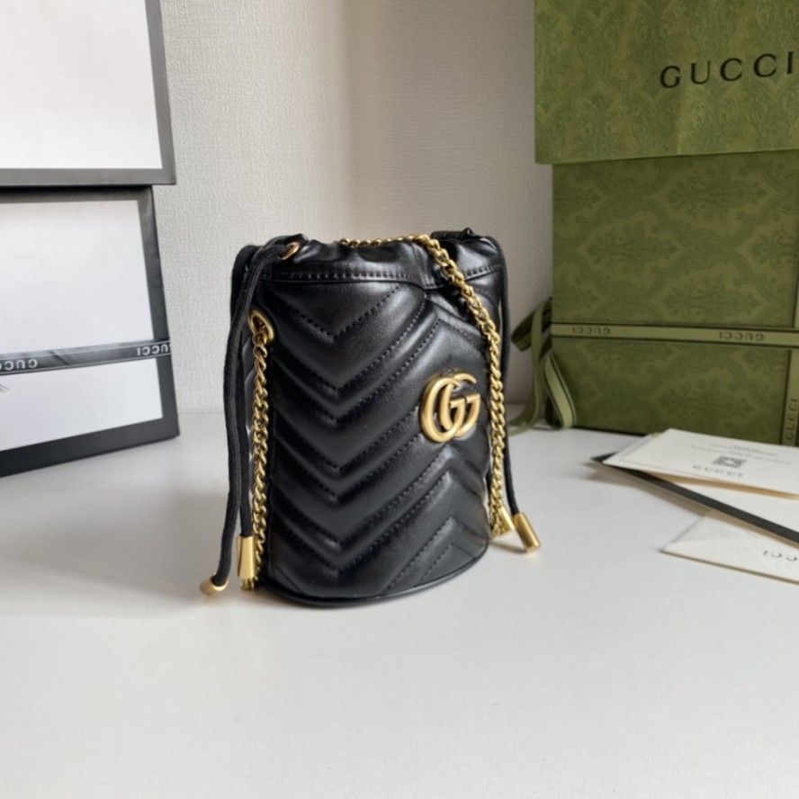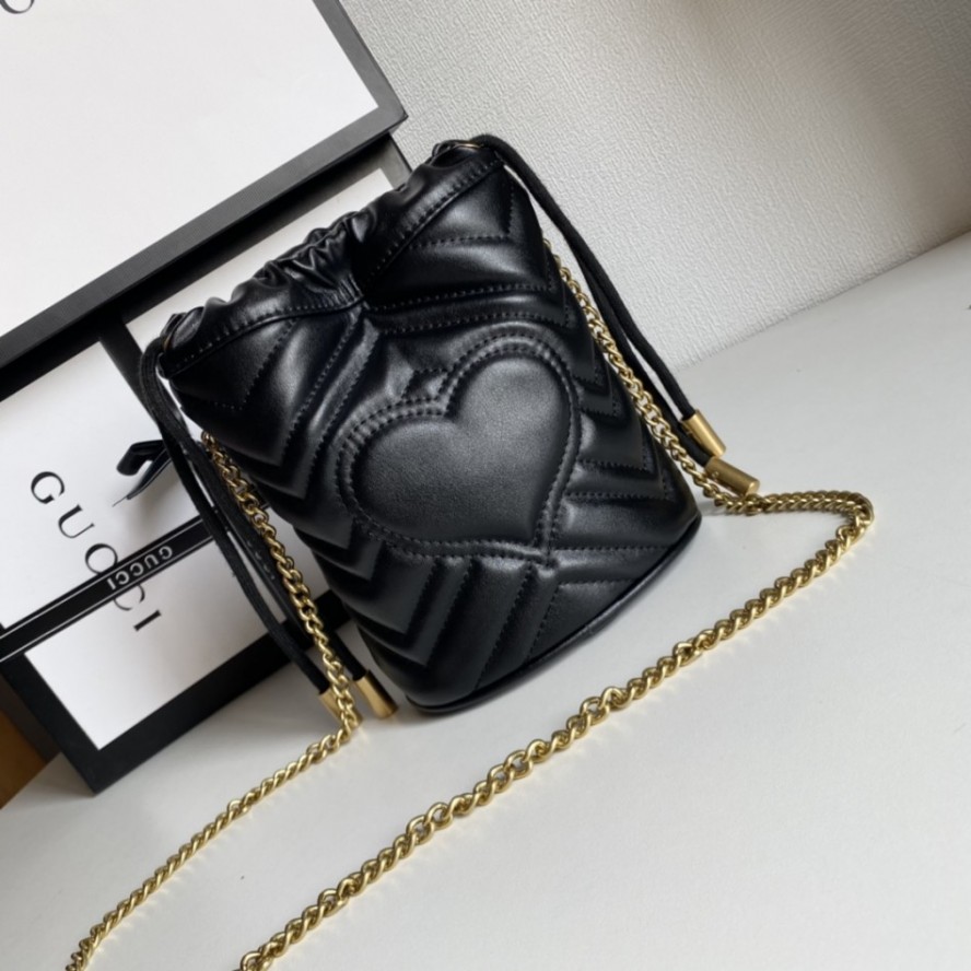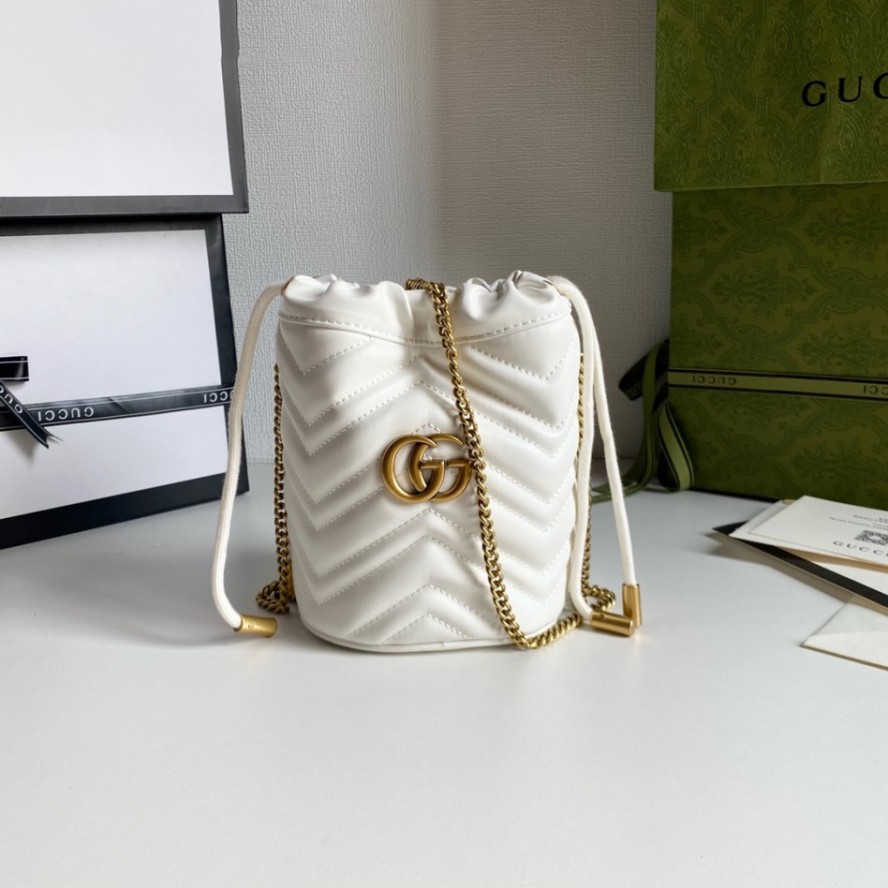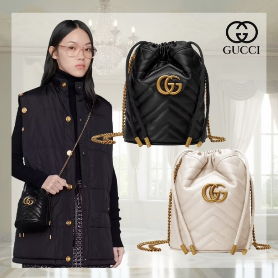バックにハートのディテールがあしらわれたホワイト キルティングレザー製の〔GGマーモント〕ミニ バケットバッグ。ダブルG のハードウェアが フロントを印象的に飾ります。これは1970年代に生まれたベルトバックルのデザインをコンテンポラリーに再解釈したもので、今やグッチを象徴する存在となりました。ゴールドトーンのチェーンストラップ付きで、ダイナミックなシェイプは様々なシーンで活躍します。