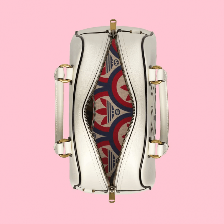 adidas x Gucci コレクションに登場したこのミニサイズのダッフルバッグは、”GUCCI adidas”&トレフォイル プリントがデザインのポイント。アディダスとグッチが初めて挑んだ本コラボレーションでは、ウェブ ストライプとホワイトのスリーストライプスの並びに、GGパターンとトレフォイルが組み合わされています。クリエイティブ?ディレクター、アレッサンドロ?ミケーレの1980年代から1990年代にかけての記憶を着想源に、グッチを象徴するモチーフと歴史あるスポーツウェアブランドであるアディダスのロゴをミックスすることで生まれた、ハイブリッドなシリーズです。2022年6月7日より販売開始