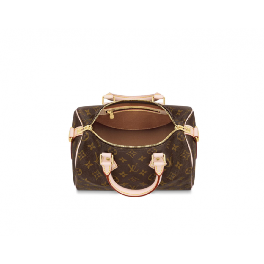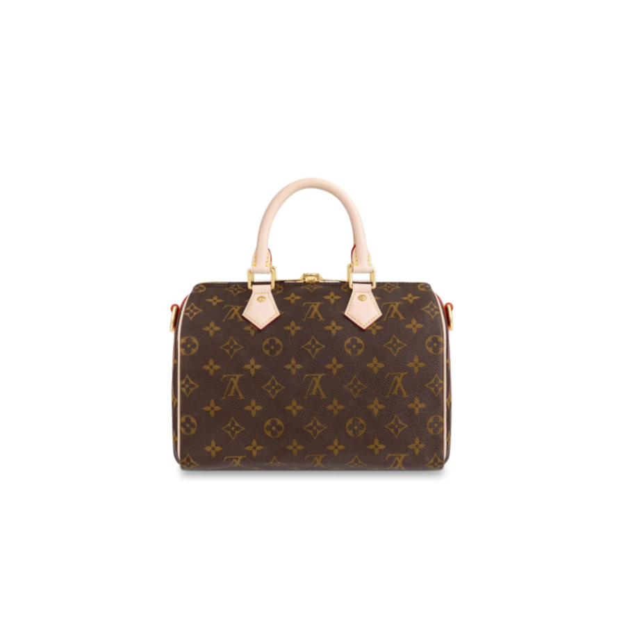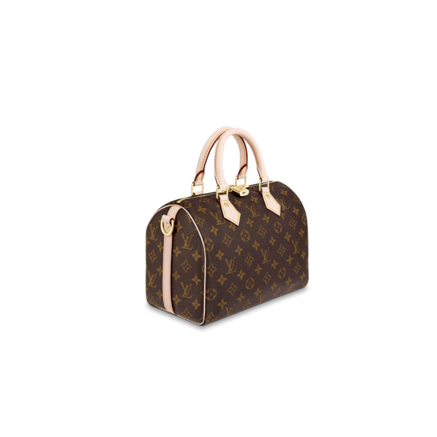 「SpeedyBandolier25」は、ユニークなモノグラムキャンバスで飾られています。 日常にふさわしいアーバンバッグ。 「スピーディ」の前身である「エクスプレス」バッグは、1930年代に旅行者のために作られました。 その名前は、当時加速していた並外れた車両にちなんで付けられました。 細部に至るまで、独特のシルエットが一目でわかる「スピーディー」な独特の革製ハンドル、刻印された南京錠、取り外し可能なショルダーストラップが特徴です。