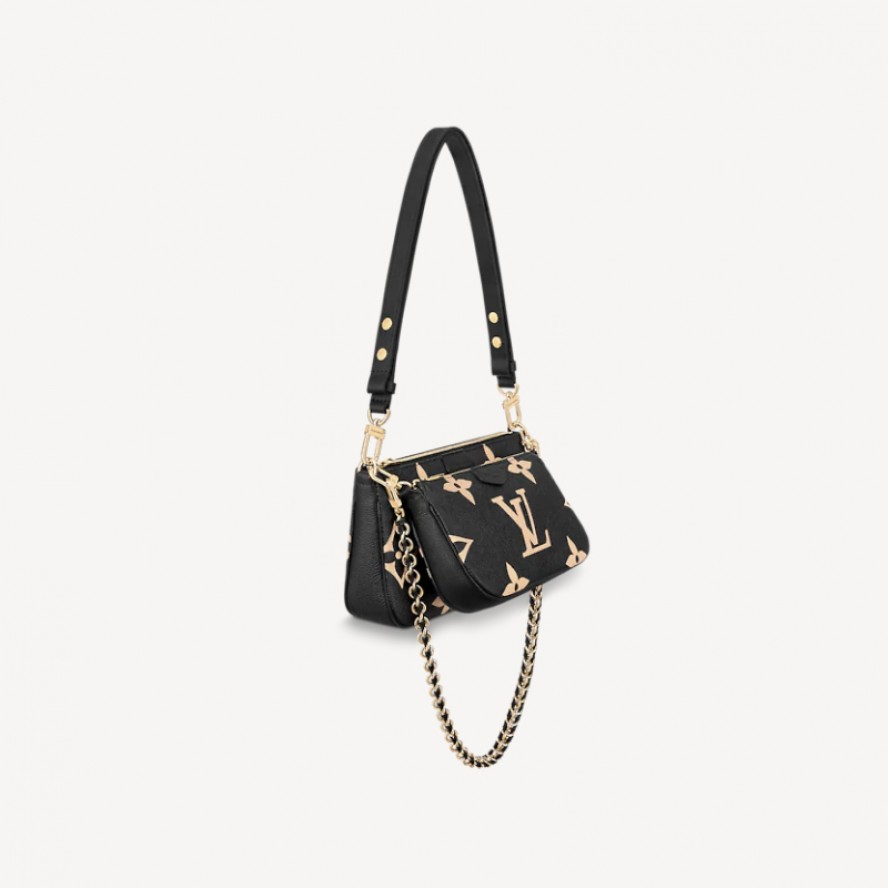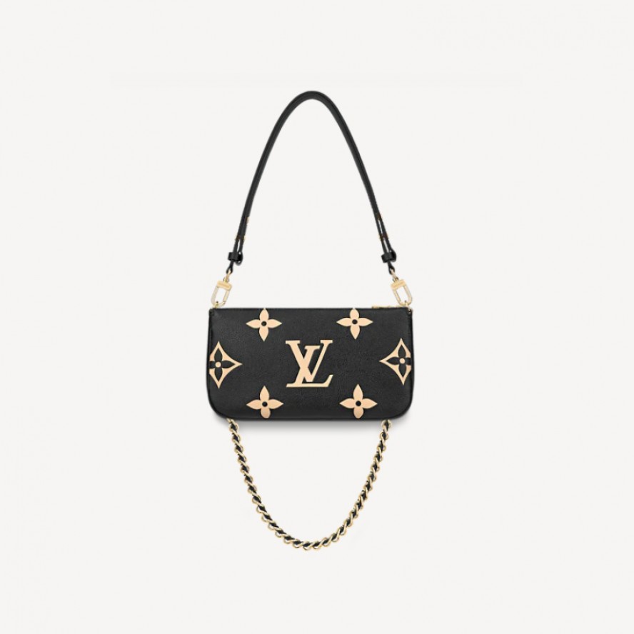 エンボス加工が特徴のブラックのモノグラム・アンプラント レザーに、クリームカラーのモノグラム・パターンをプリントした「ミュルティ・ポシェット・アクセソワール」。印象的なクロスボディバッグです。2つのバッグを一体化させ、女性の必需品を持ち運ぶのに最適なサイズに仕上げ、取外し可能なポーチも備えています。しなやかで軽量な持ち運びしやすいアイテムです。