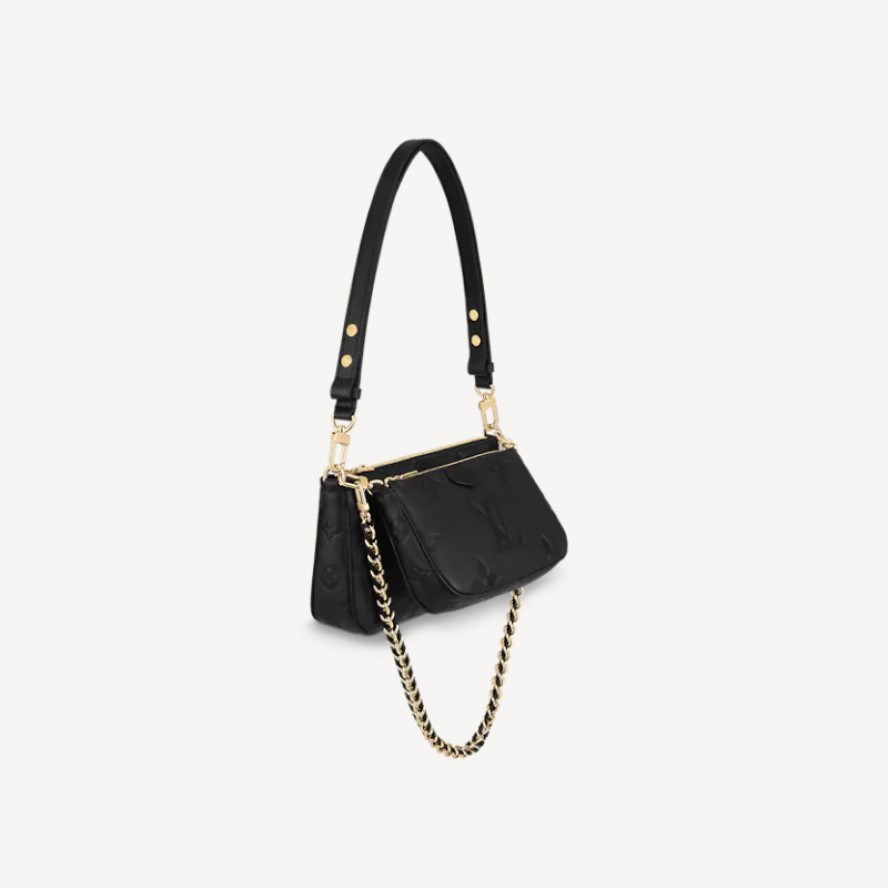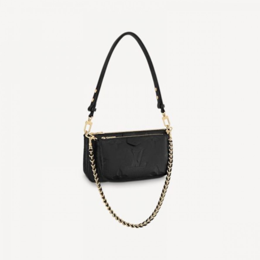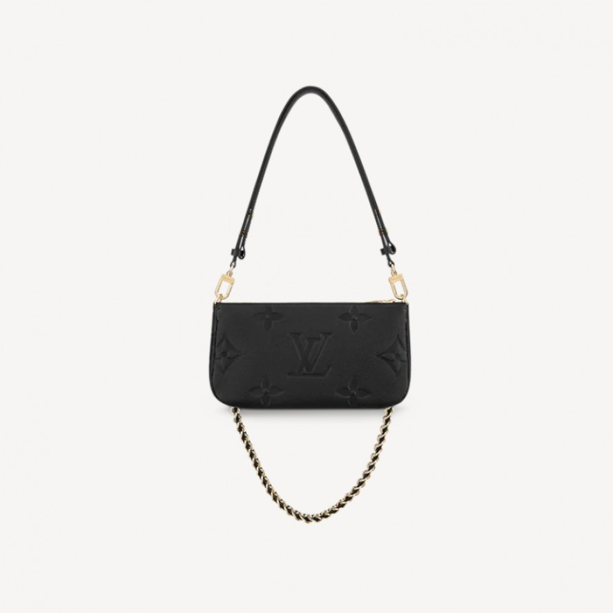 モノグラム・アンプラント レザーで仕立てた多機能なクロスボディバッグ「ミュルティ・ポシェット・アクセソワール」。1つのバッグで2つのスタイルをお楽しみいただけるデザインに個性を放つ2つのポーチ、ゴールドカラーのチェーン、レザーストラップは、いずれも取外し可能です。フロントにエンボス加工したオーバーサイズのモノグラムが、サイドのマチに添えたクラシカルなモノグラム・パターンと絶妙なコントラストを描きます。
