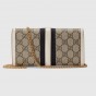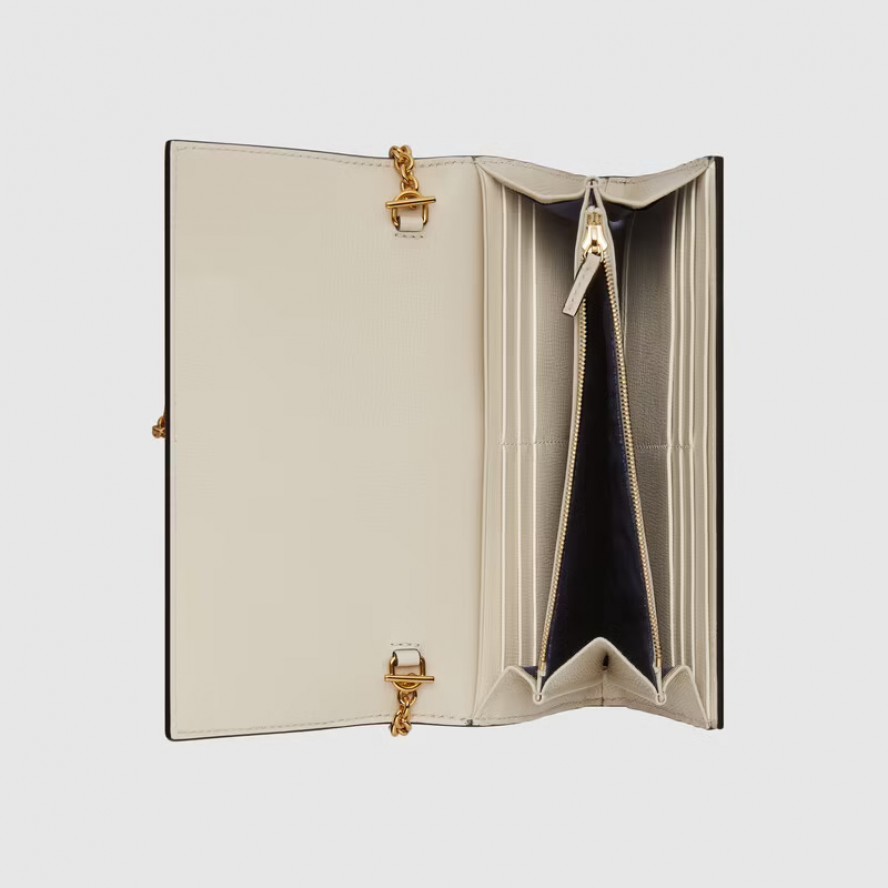 〔ジャッキー 1961〕ラインに、オリジナルのハーフムーンシェイプをアレンジしたスリムなチェーンウォレットが登場。コンテンポラリーなシルエットにGGスプリーム キャンバスとグリーン/レッド/グリーン ウェブ ストライプを組み合わせることで、過去と現在のつながりを強調しています。コントラストカラーのホワイトレザーでトリムを施しています。
