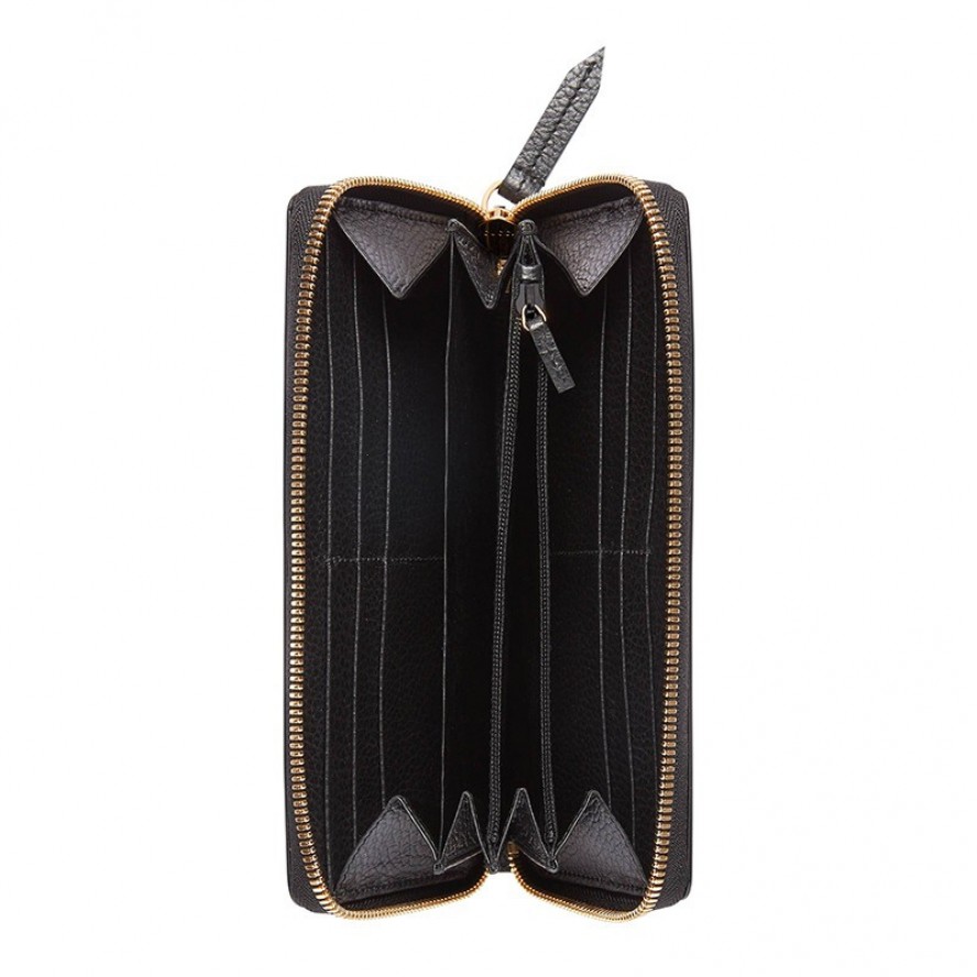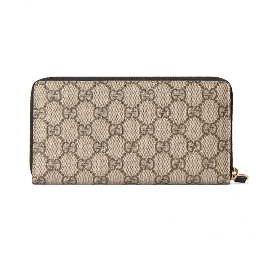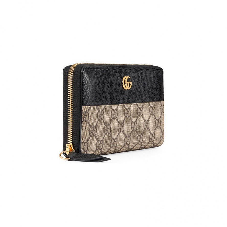 GGスプリーム キャンバスとブラックレザーを組み合わせ、グッチを象徴するダブルGの小さなハードウェアをあしらったジップアラウンドウォレット |