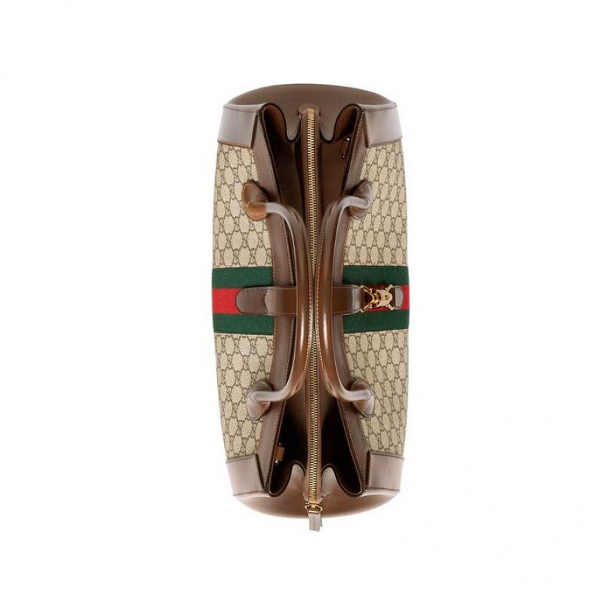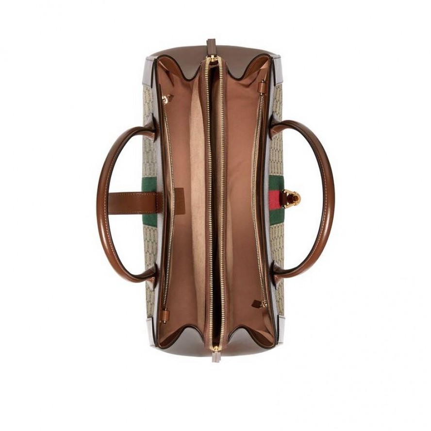 〔ジャッキー〕バッグには、グッチの黄金期にデザインされたヴィンテージシェイプやアーカイブディテールを取り入れています。このラージサイズのトートバッグは、GGスプリーム キャンバスを使用してかっちりとしたシェイプに仕立て、同系色のレザーでトリムを施しました。さらに、ラインを象徴するピストンクロージャーとウェブストライプをあしらっています。 |