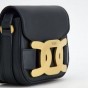 マキシサイズのチェーン モチーフ メタルアクセサリーを配したエレガントなスムース レザーのミニ バッグ。マグネット クロージャー付きのフラップ、調節可能なショルダーストラップを合わせました。