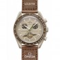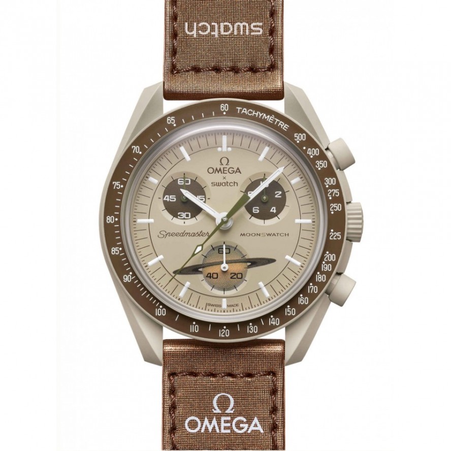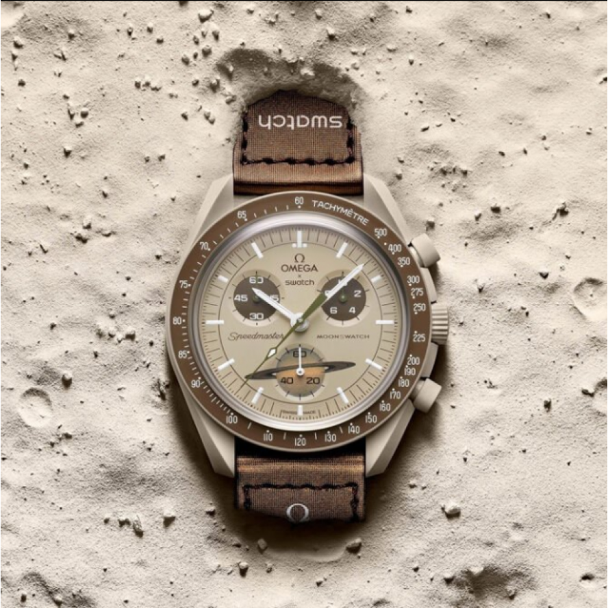 このモデルでは、砂のようなクールなベージュの色調が、茶色の文字盤とベルクロ©ストラップと見事に対照的です。クロノグラフ秒針、サブダイヤル針、タキメータースケールの背景も茶色です。秒のサブダイヤルは土星の環を表しています。すべての文字盤には、OMEGA X SWATCHのブランドに加えて、象徴的なSpeedmasterロゴと新しいMoonSwatchロゴが付いています。ガラス構造、クリスタルの中央に統合された「隠し」S、文字盤の外輪とサブダイヤルの細かく洗練された円形パターン、シャープで滑らかなラグ構造、タキメーターの象徴的な「ドットオーバー90」のディテールスケーリングされたベゼル、そしてもちろんユニークなバイオセラミックタッチはすべてのモデルに共通であり、細部への情熱的な愛を表しています。すべての時間、分、クロノグラフの秒針と時間マーカーは、暗闇の中で完璧な輝きを放つスーパールミノバを備えています。