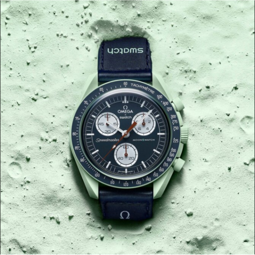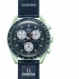エコ宇宙飛行士は、ネイビーブルーのベルクロ©ストラップが付いたこのアースグリーンの時計を気に入るはずです。クロノグラフの秒針とカウンター針は茶色です。サブダイヤルは白です。青いベゼルの背景にあるタキメータースケールも同様です。すべての文字盤には、OMEGA X SWATCHのブランドに加えて、象徴的なSpeedmasterロゴと新しいMoonSwatchロゴが付いています。ガラス構造、クリスタルの中央に統合された「隠し」S、文字盤の外輪とサブダイヤルの細かく洗練された円形パターン、シャープで滑らかなラグ構造、タキメーターの象徴的な「ドットオーバー90」のディテールスケーリングされたベゼル、そしてもちろんユニークなバイオセラミックタッチはすべてのモデルに共通であり、細部への情熱的な愛を表しています。すべての時間、分、クロノグラフの秒針と時間マーカーは、暗闇の中で完璧な輝きを放つスーパールミノバを備えています。