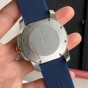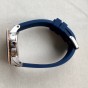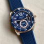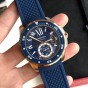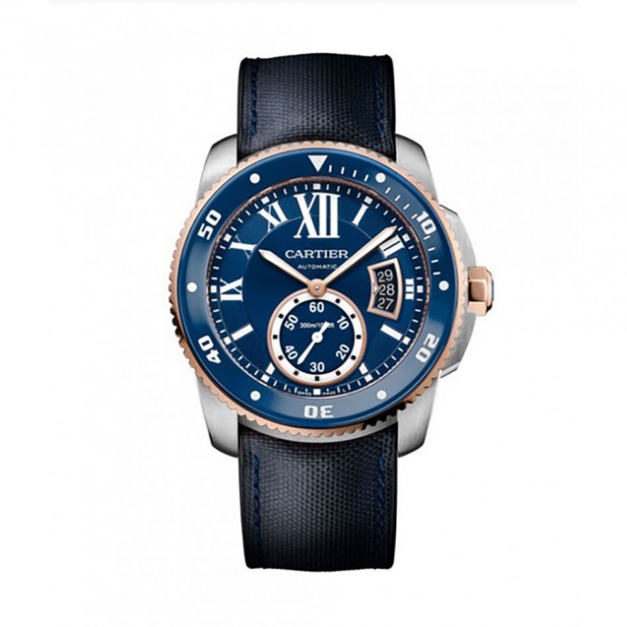ステンレス製のスイス製オリジナルウォッチキャリバードゥカルティエダイバーブルー(ref。W2CA0008)、ブルーADLCコーティングを施したスチール製回転ベゼル、ブルーラバーとカーフスキンストラップ、日付表示器、自動巻き。時計会社カルティエのアップデートバージョンで2016年に新登場。プレス加工されたカーフスキンで作られた青いストラップのステンレススチールケースにラバーを含浸させ、18Kローズゴールドのクラシックなバックルを備えています。