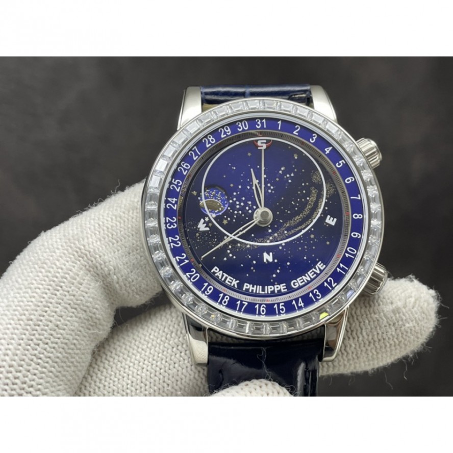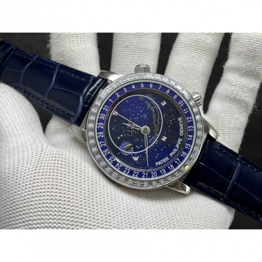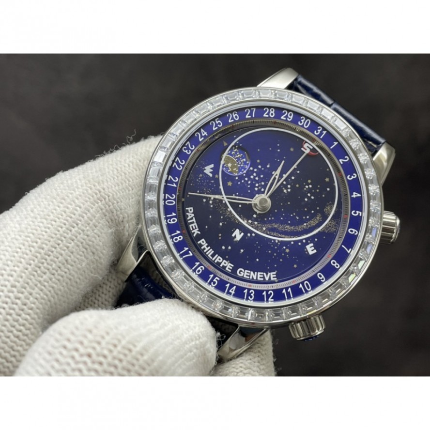 天空の動きを再現する星座表を搭載したセレスティアルは、パテック フィリップの天文表示タイムピースにおける偉大な伝統へのトリビュートといえましょう。セレスティアルのオーナーは、いつでも好きな時に北半球の星と月の動き、そして月の満ち欠けを文字盤上で見ることができます。スケルトンの長・短針は、平均太陽時による分・時を表示します。サファイヤクリスタル・ガラスの内面に描かれた楕円は、ジュネーブ、およびジュネーブと同一の緯度にあるすべての地点で見える天空部分を示します。