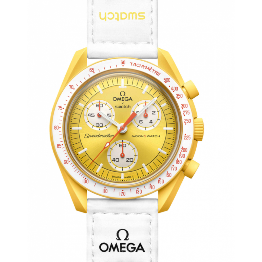 明るいサンイエローのこのショーのスターは、洗練されたサンブラッシュスタイルの文字盤と白いベルクロ©ストラップを備えています。クロノグラフ秒針、サブダイヤル針、タキメーター目盛りはオレンジ色です。サブダイヤルとベゼルの背景は白です。すべての文字盤には、OMEGA X SWATCHのブランドに加えて、象徴的なSpeedmasterロゴと新しいMoonSwatchロゴが付いています。ガラス構造、クリスタルの中央に統合された「隠し」S、文字盤の外輪とサブダイヤルの細かく洗練された円形パターン、シャープで滑らかなラグ構造、タキメーターの象徴的な「ドットオーバー90」のディテールスケーリングされたベゼル、そしてもちろんユニークなバイオセラミックタッチはすべてのモデルに共通であり、細部への情熱的な愛を表しています。すべての時間、分、クロノグラフの秒針と時間マーカーは、暗闇の中で完璧な輝きを放つスーパールミノバを備えています。
