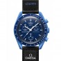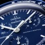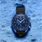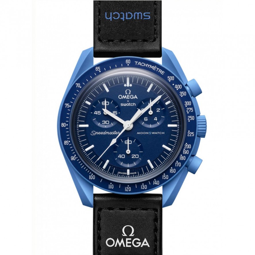 濃紺のトーンと黒のベルクロ©ストラップの強烈な組み合わせにより、この時計は暗闇の愛好家に最適です。対照的に、クロノグラフ秒針、サブダイヤル針、タキメーター目盛りは白です。すべての文字盤には、OMEGA X SWATCHのブランドに加えて、象徴的なSpeedmasterロゴと新しいMoonSwatchロゴが付いています。ガラス構造、クリスタルの中央に統合された「隠し」S、文字盤の外輪とサブダイヤルの細かく洗練された円形パターン、シャープで滑らかなラグ構造、タキメーターの象徴的な「ドットオーバー90」のディテールスケーリングされたベゼル、そしてもちろんユニークなバイオセラミックタッチはすべてのモデルに共通であり、細部への情熱的な愛を表しています。すべての時間、分、クロノグラフの秒針と時間マーカーは、暗闇の中で完璧な輝きを放つスーパールミノバを備えています。