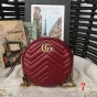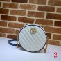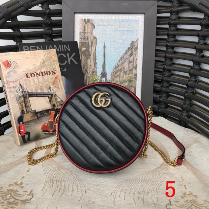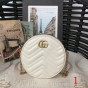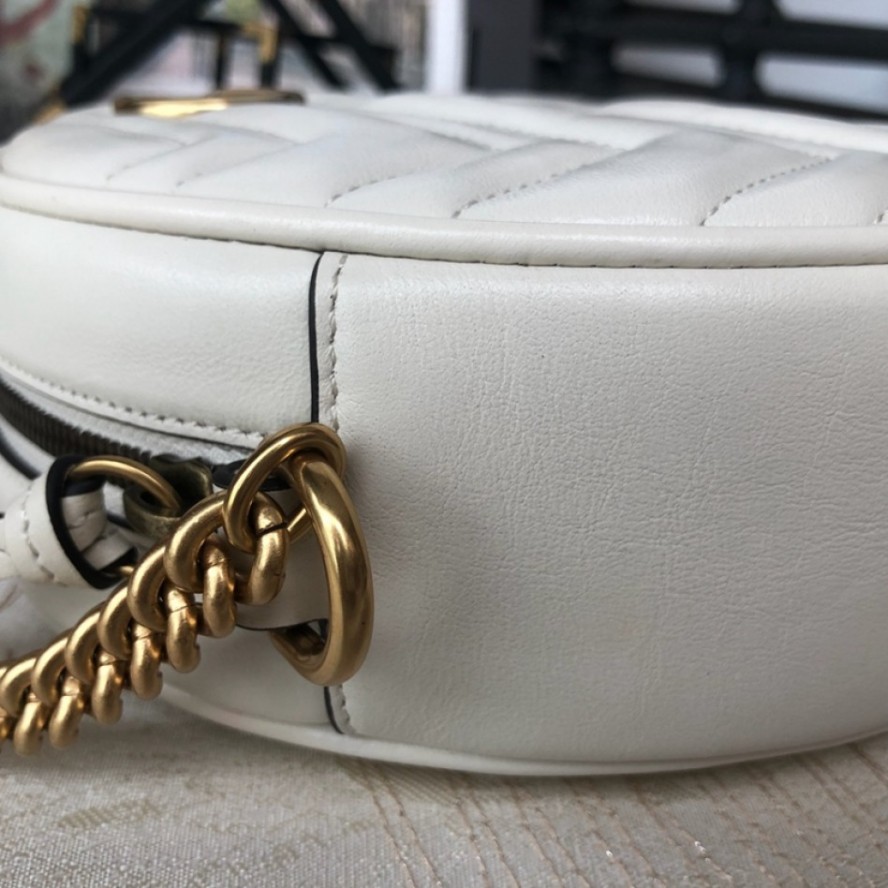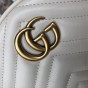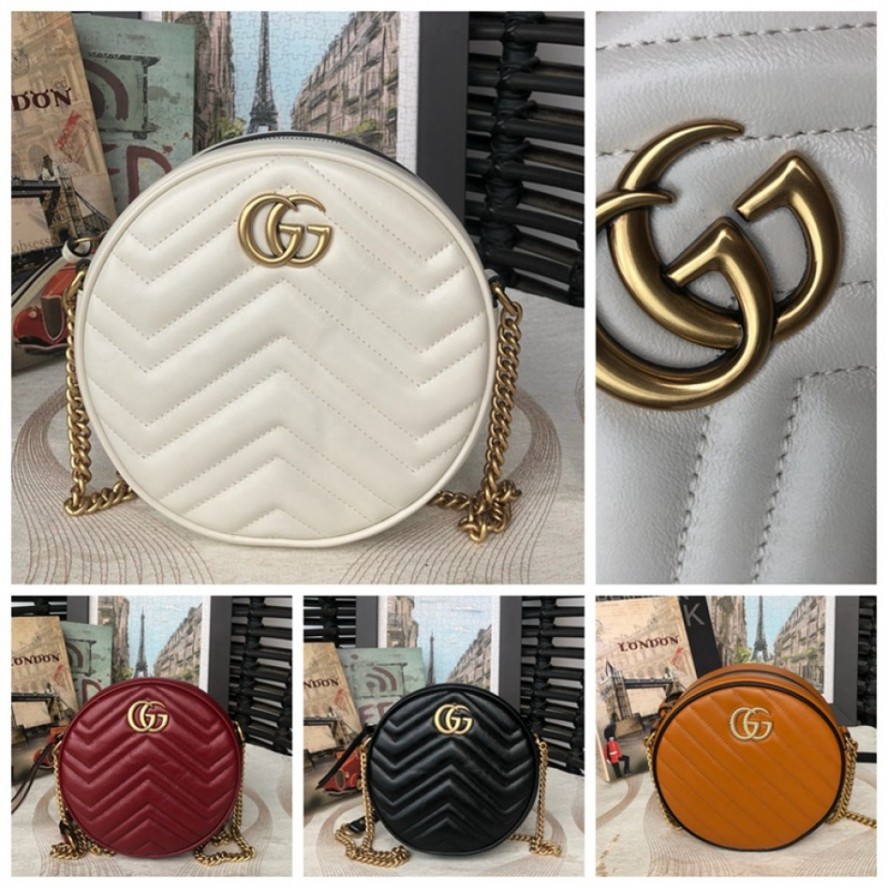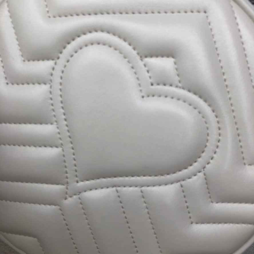 〔GGマーモント〕ラインの新作ミニバッグ。ラウンドフォルムにチェーン ショルダーストラップが付いています。ヴィンテージ感漂うこのバッグのフロントにはグッチを象徴するダブルG ハードウェア、バックにはシェブロン キルティング レザーのハート ディテールがあしらわれています。