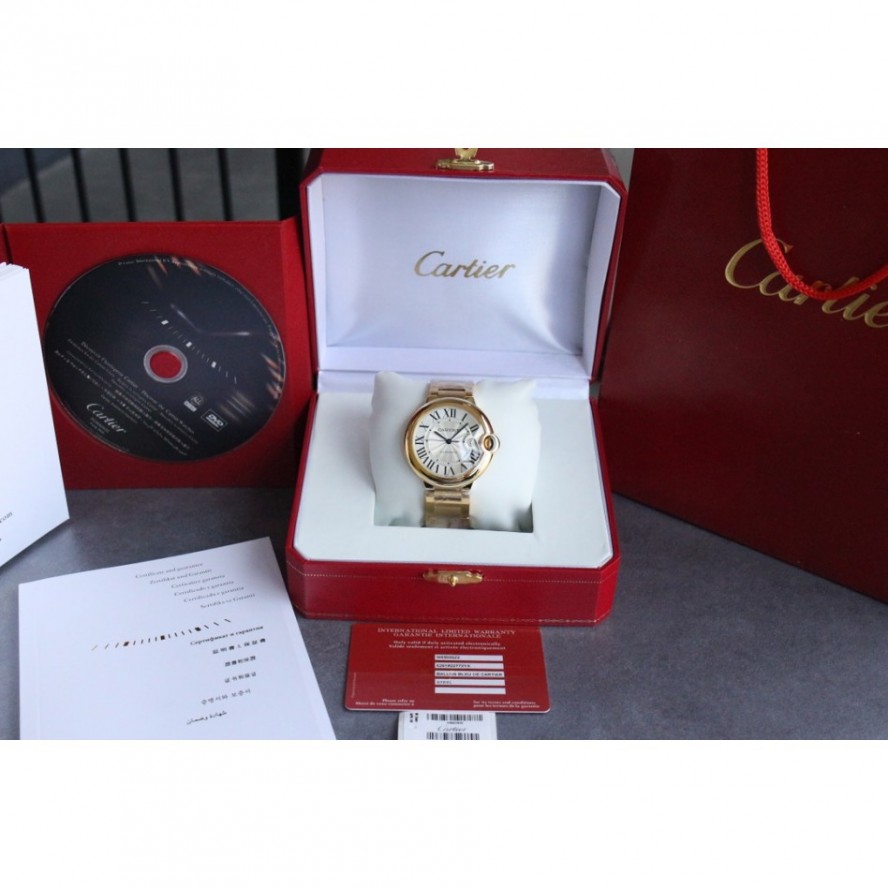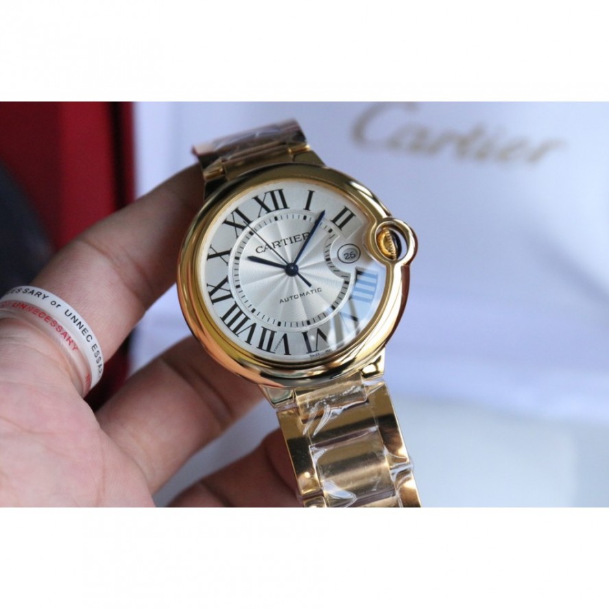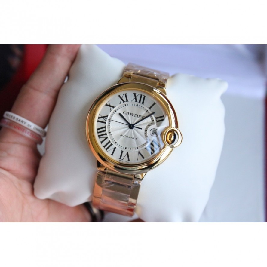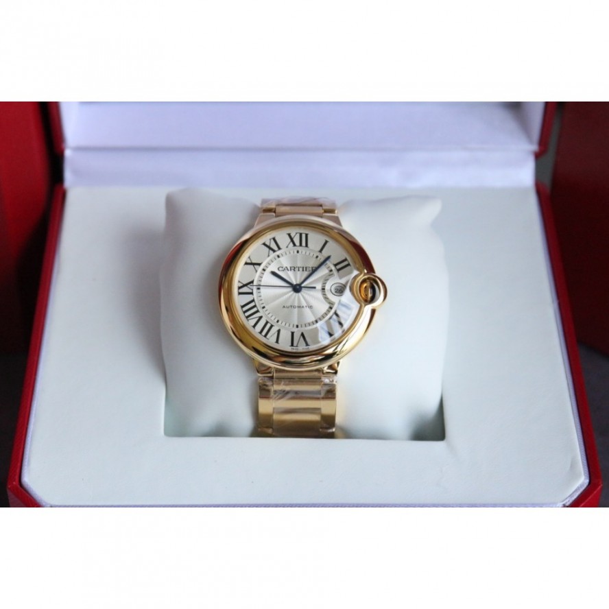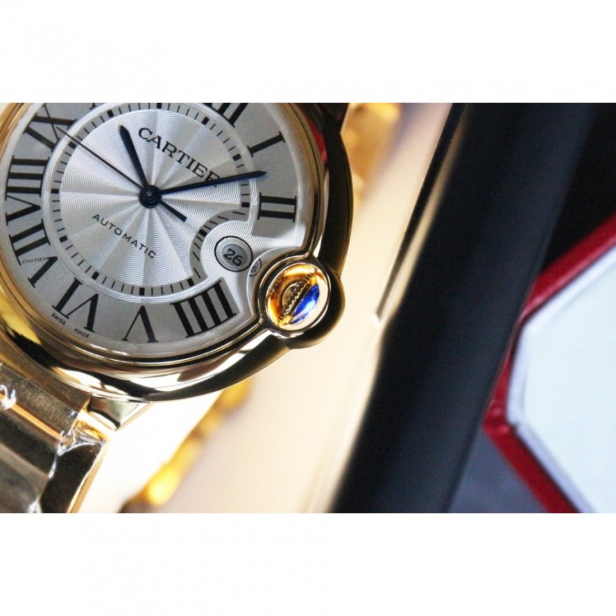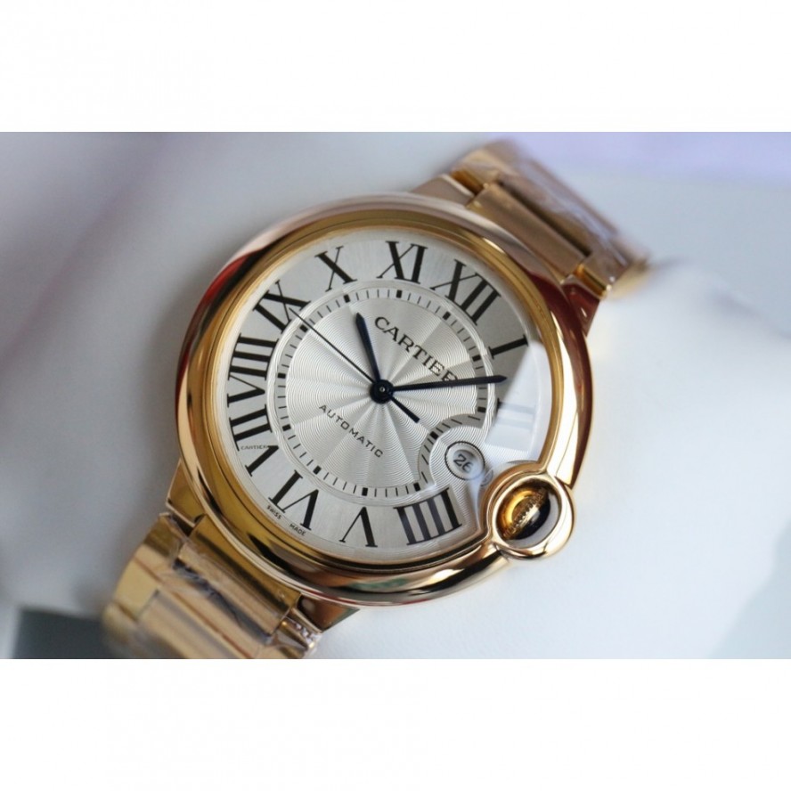 バロンブルードゥカルティエブルーバルーンウォッチ、42 mmモデル、自動巻き機械式ムーブメント。18Kローズゴールドケース、フルーティングを施されたリューズ、サファイアカボション、シルバーメッキの真珠光沢のギョーシェ模様の文字盤、ローマ数字のアワーマーカー、剣型の青いスチール針、サファイアクリスタル、18Kローズゴールドブレスレット、カレンダー表示ウィンドウは3に設定されています時。ケースサイズ:直径:42.1mm。厚さ:13mm。30メートルまでの耐水性。