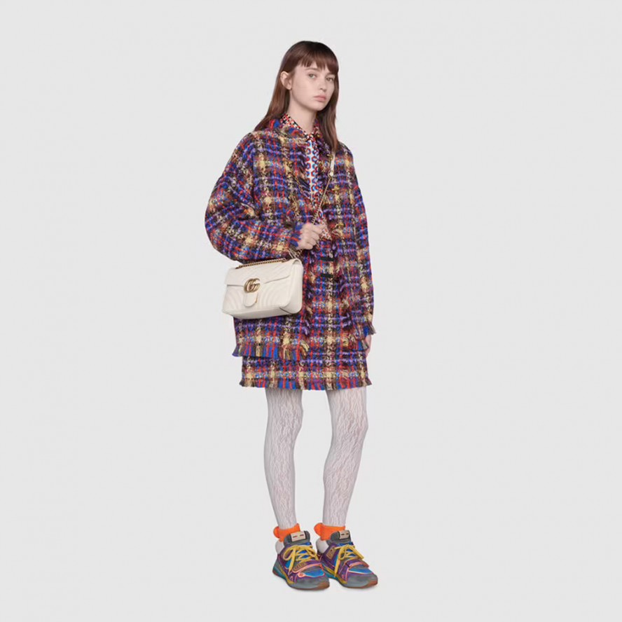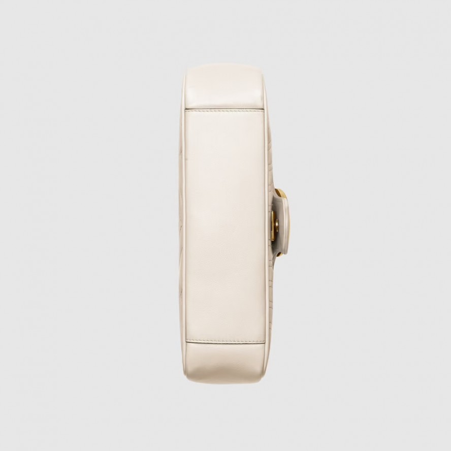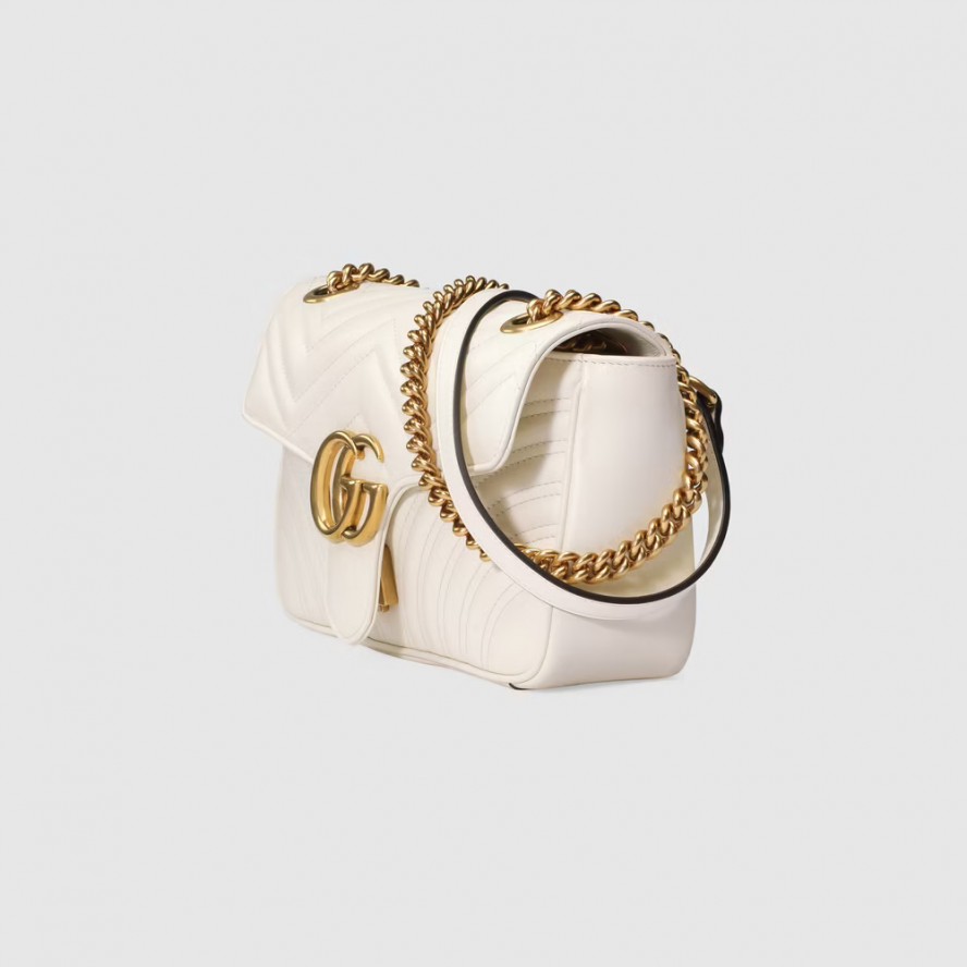 ソフトなストラクチャードシェイプが特徴的なスモールサイズの〔GGマーモント〕 チェーンショルダーバッグ。オーバーサイズのフラップ クロージャーにダブルG ハードウェアがあしらわれています。スライド式チェーンストラップにより、ショルダーバッグからトップハンドルバッグまでさまざまなスタイルでご使用いただけます。バックのGGが印象的なキルティング シェブロンレザー製。