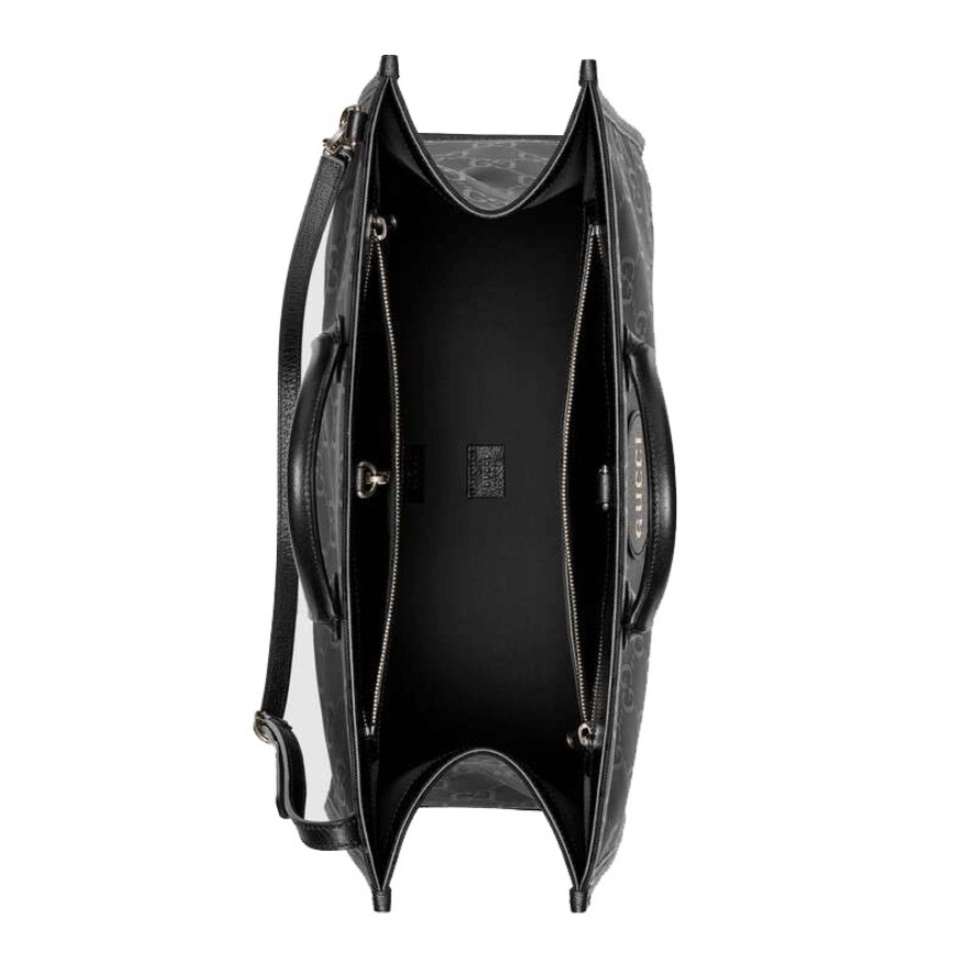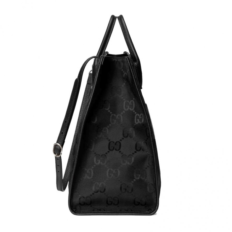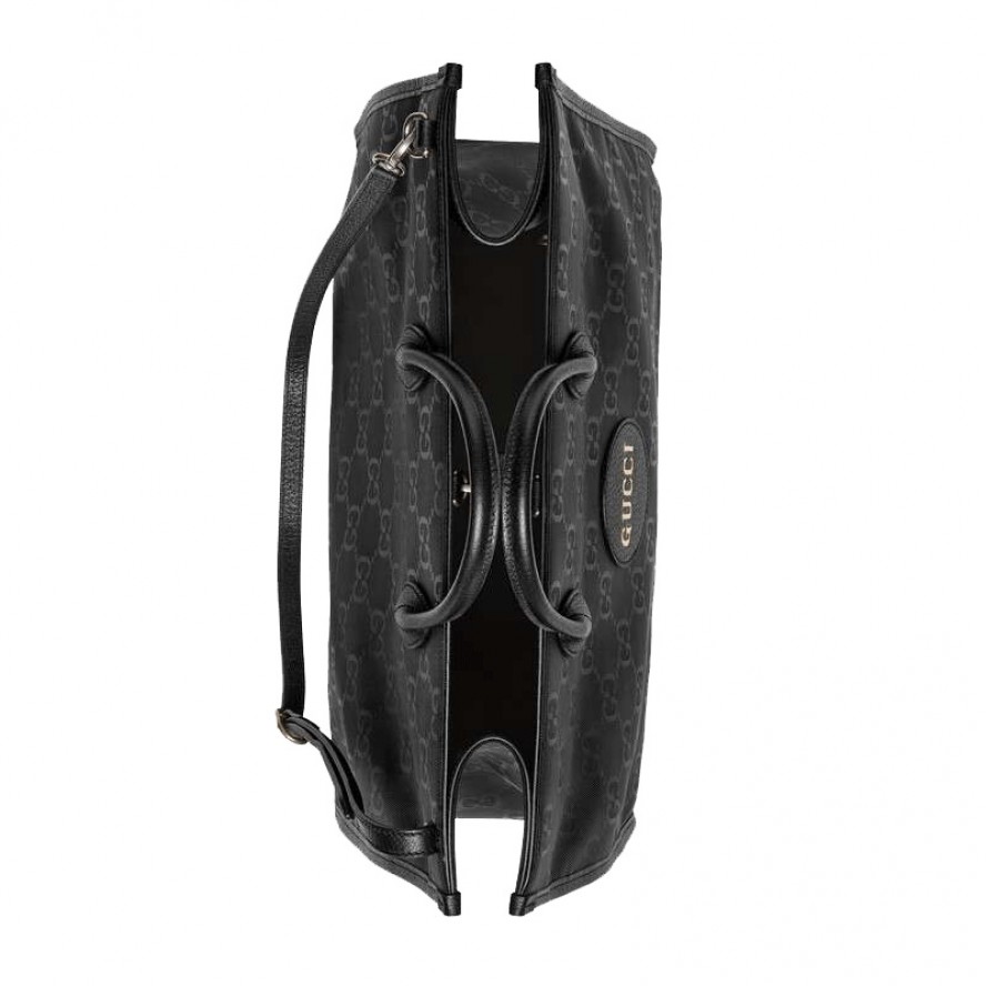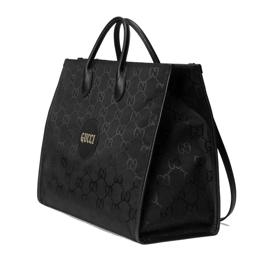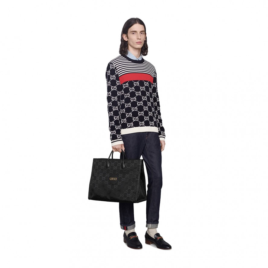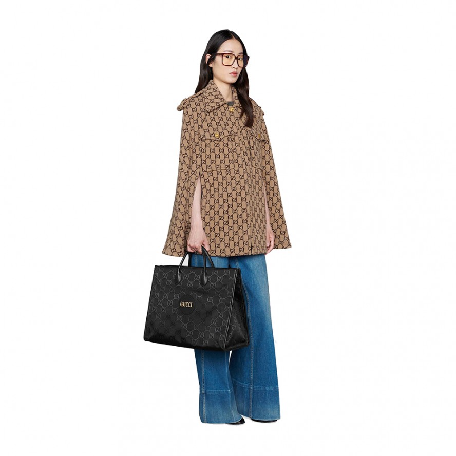グッチのサステナビリティに対する取り組みの一環として、リサイクル素材を採用したアクセサリー&ウェア コレクション「Gucci Off The Grid」 が誕生。グッチの循環型生産のビジョンをサポートするために開発された「Gucci Circular Lines」からの最初のコレクションです。「Gucci Off The Grid」 のアイテムは、環境への影響に配慮してデザインされ、リサイクル、オーガニック、バイオ由来をはじめとしたサステナビリティに考慮した素材・原料を用いています。このダブルハンドルのトートバッグは、再生ナイロン糸を用いてブラックのベースにGGパターンを描き出した生地と環境に配慮した素材のトリムで仕立てました。片側を外してバッグの中に収納できるショルダーストラップが付属しています。 |