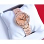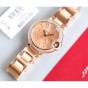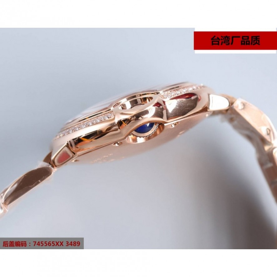 フランスのジュエリーと時計の家カルティエのオリジナルクラシックモデルバロンブルードゥカルティは、スチールブレスレットを身に着けた女性用のミニチュアサイズ33mmです。ステンレススチールとロックゴールドのケース、フェイクスピネルカボションをあしらったフルーティングを施されたスチールクラウン、サファイアクリスタル
