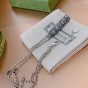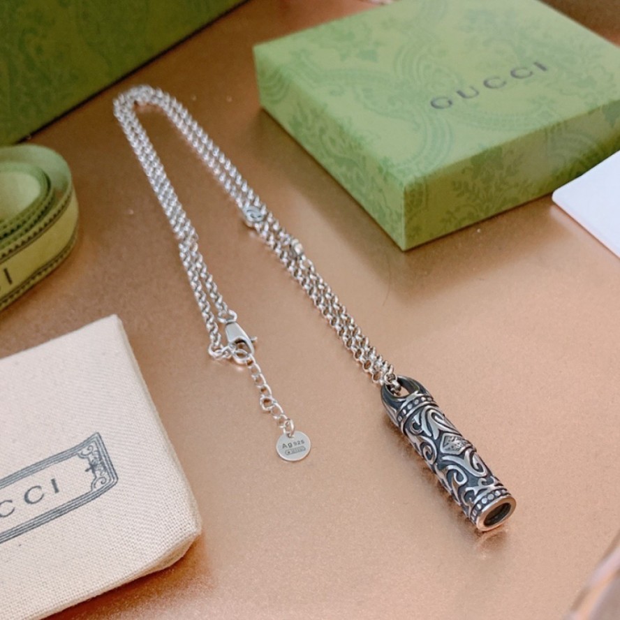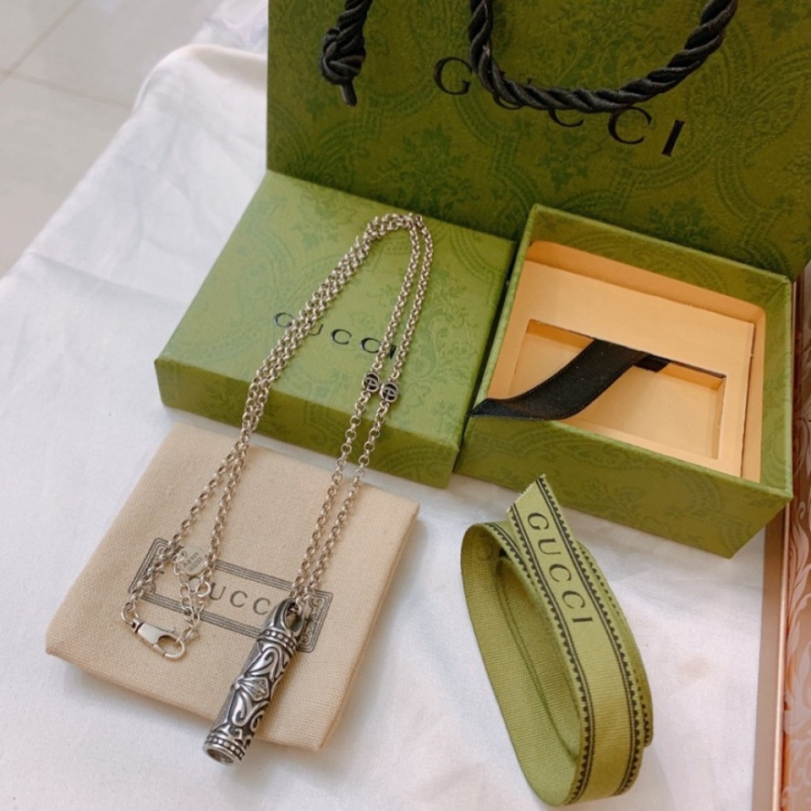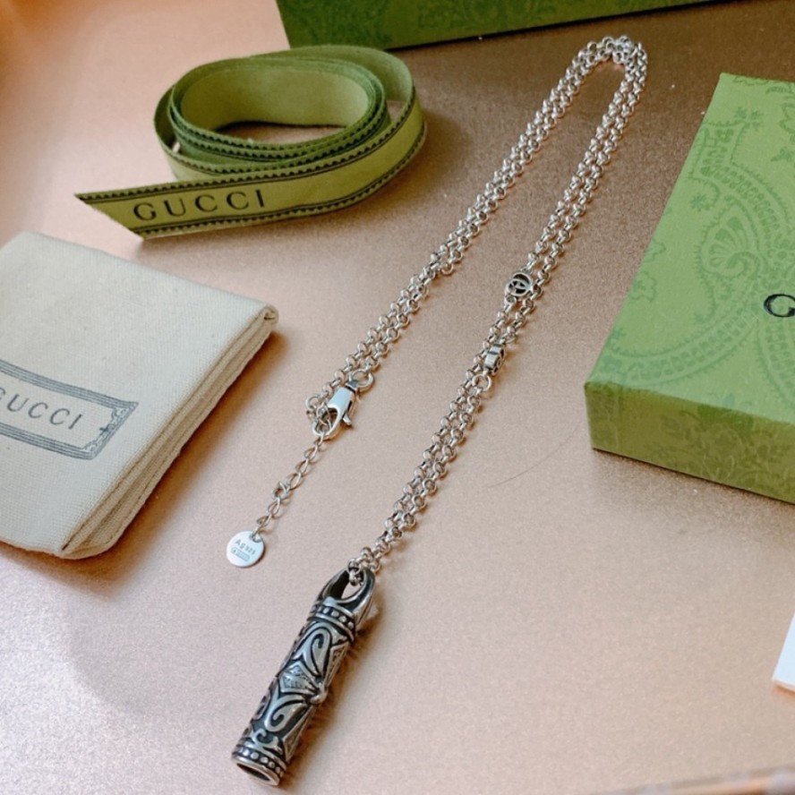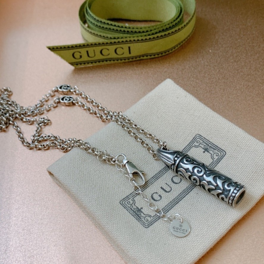 テクスチャードリンクとスムースリンクを交互に配した、コンテンポラリーな雰囲気のシルバーチェーンのネックレス。グッチを象徴するインターロッキングGをエングレービングで表現したペンダントが存在感を放っています。